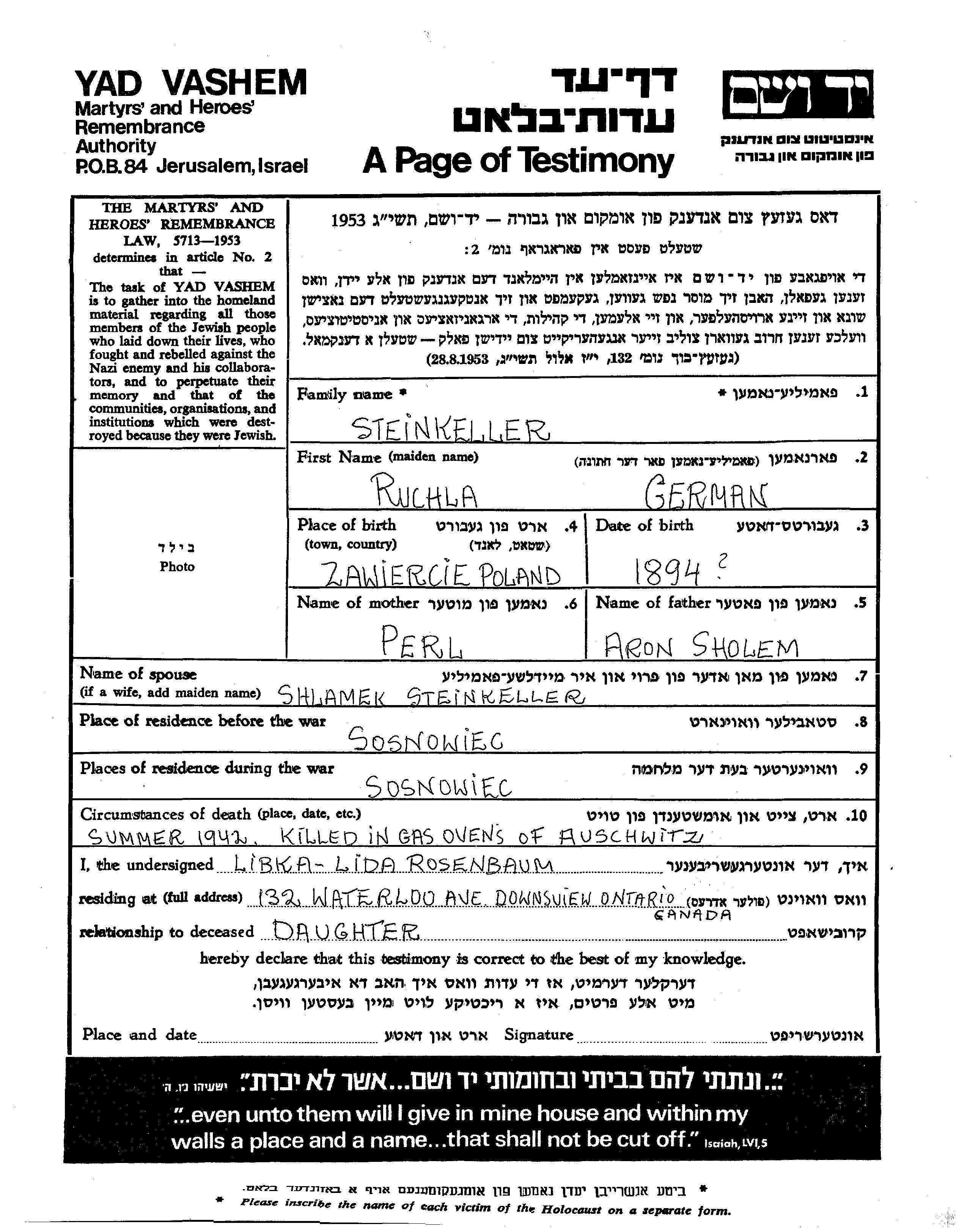 Ruchla Steinkeller לבית גרמן נולדה בZawiercie שבפולין בשנת 1894 לארון שולם וPerl. היא היתה נשואה לShlamek. לפני מלחמת העולם השניה התגוררה בSosnowiec שבפולין. בזמן המלחמה היא היתה בSosnowiec שבפולין. היא נרצחה בשואה. מקום המוות: Auschwitz שבפולין בשנת 1942.