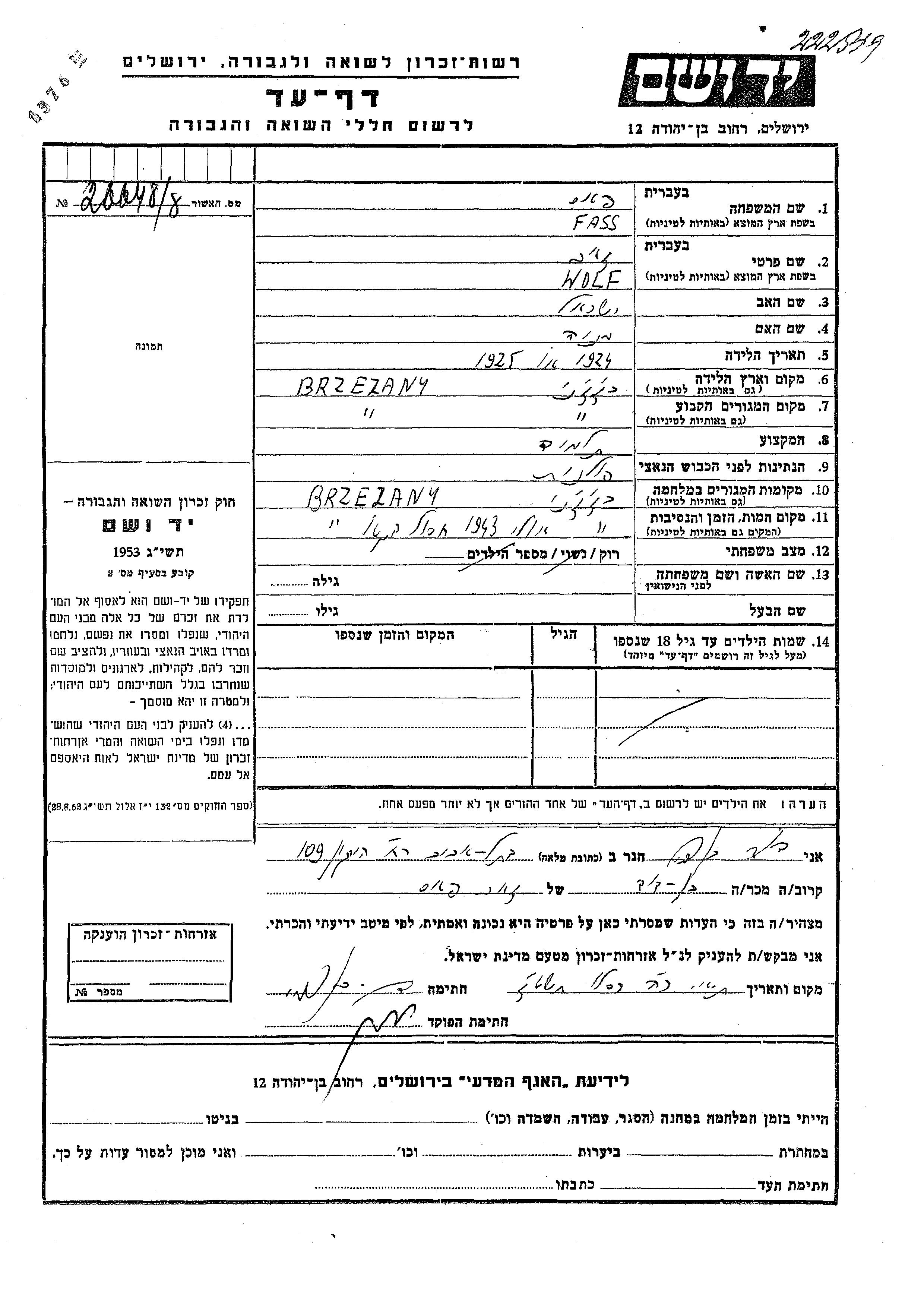 Wolf זאב Fass נולד בBrzeżany שבפולין בשנת 1924. הוא היה תלמיד. לפני מלחמת העולם השניה התגורר בBrzeżany שבפולין.