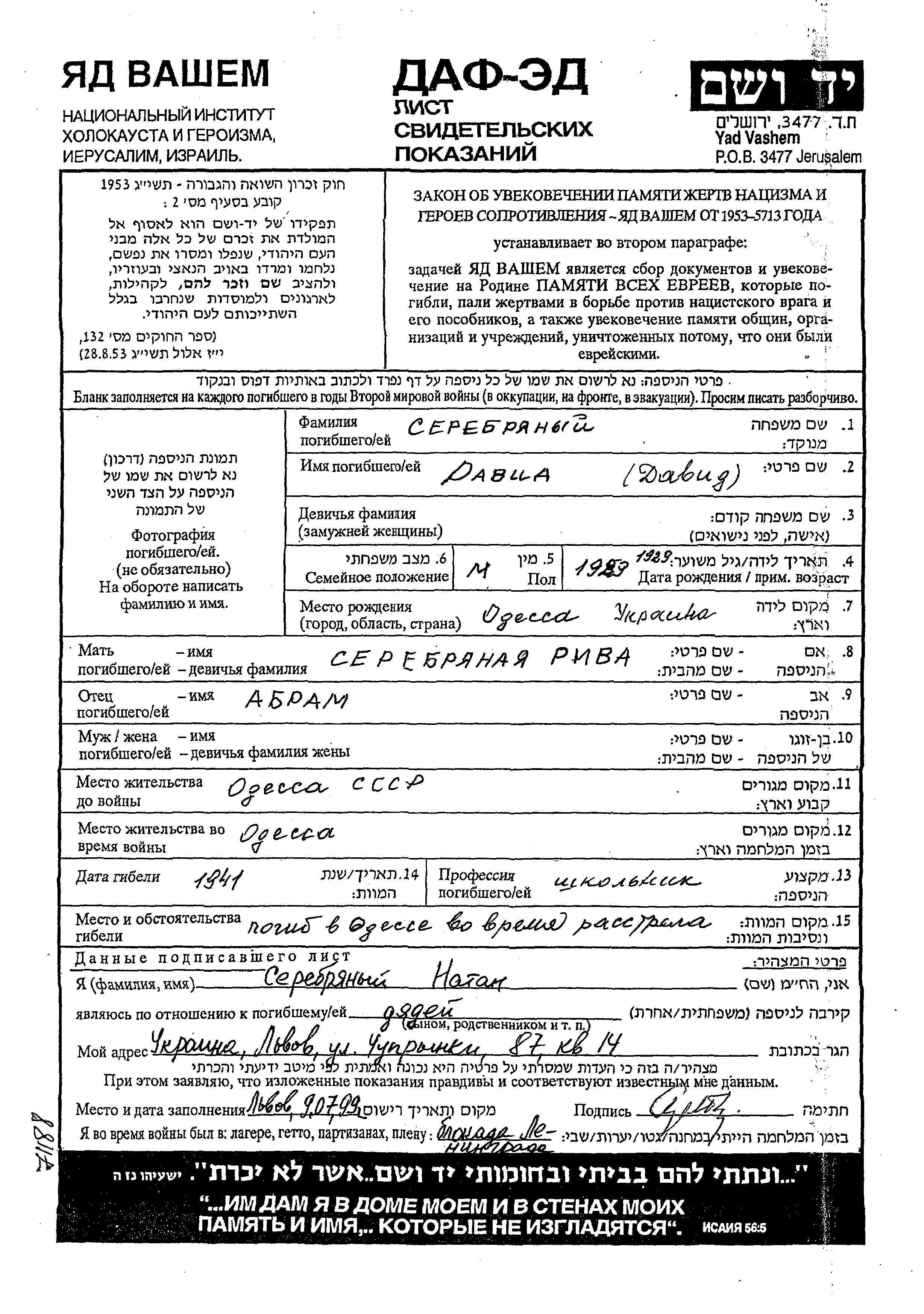 דוד Serebryanny נולד בOdessa שבאוקראינה (ברה"מ) בשנת 1929. לפני מלחמת העולם השניה התגורר בOdessa שבאוקראינה (ברה"מ).
