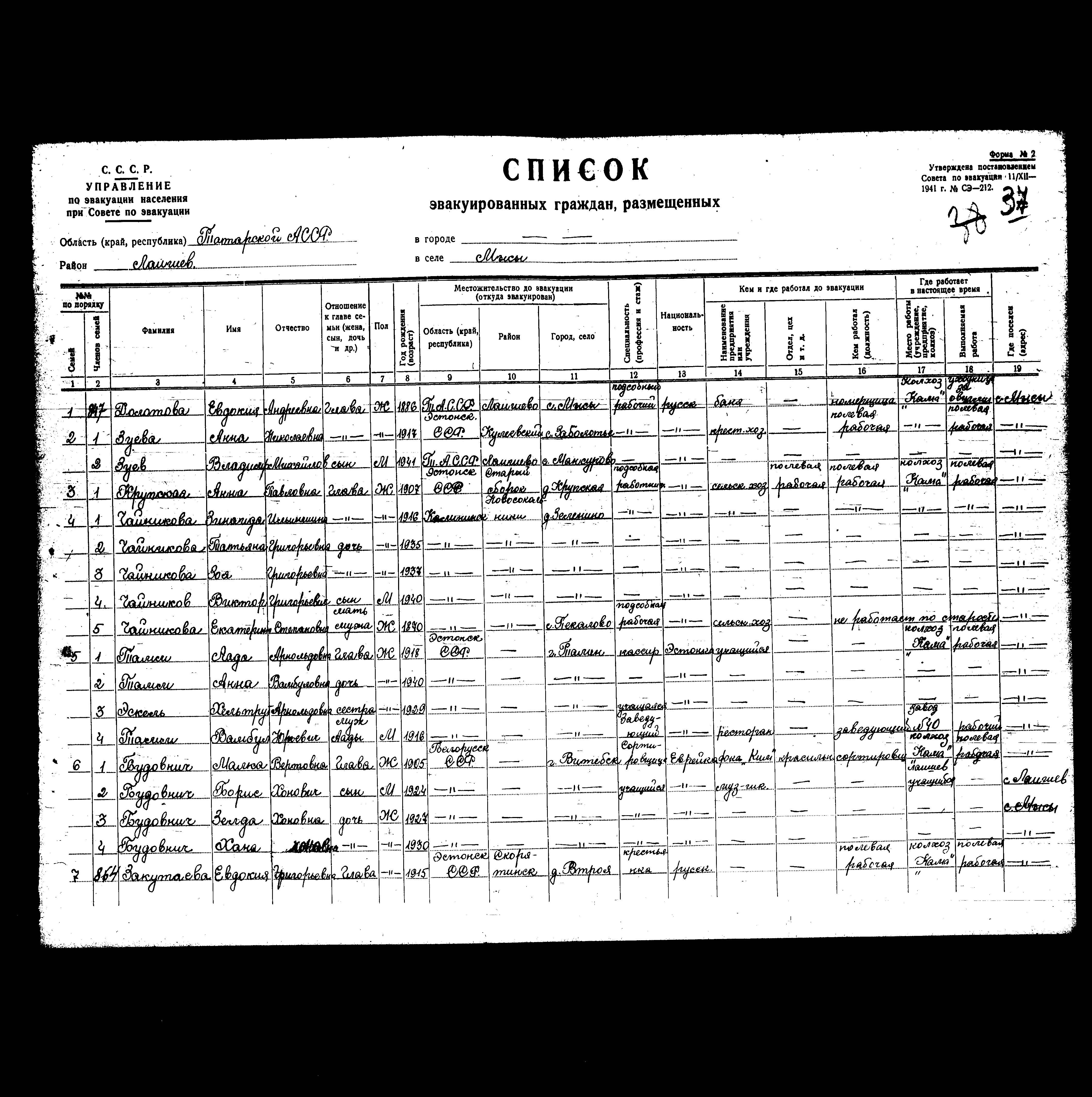 רשימת תושבים שפונו לנפת Laishevo, שהוכנה בשנת 1942