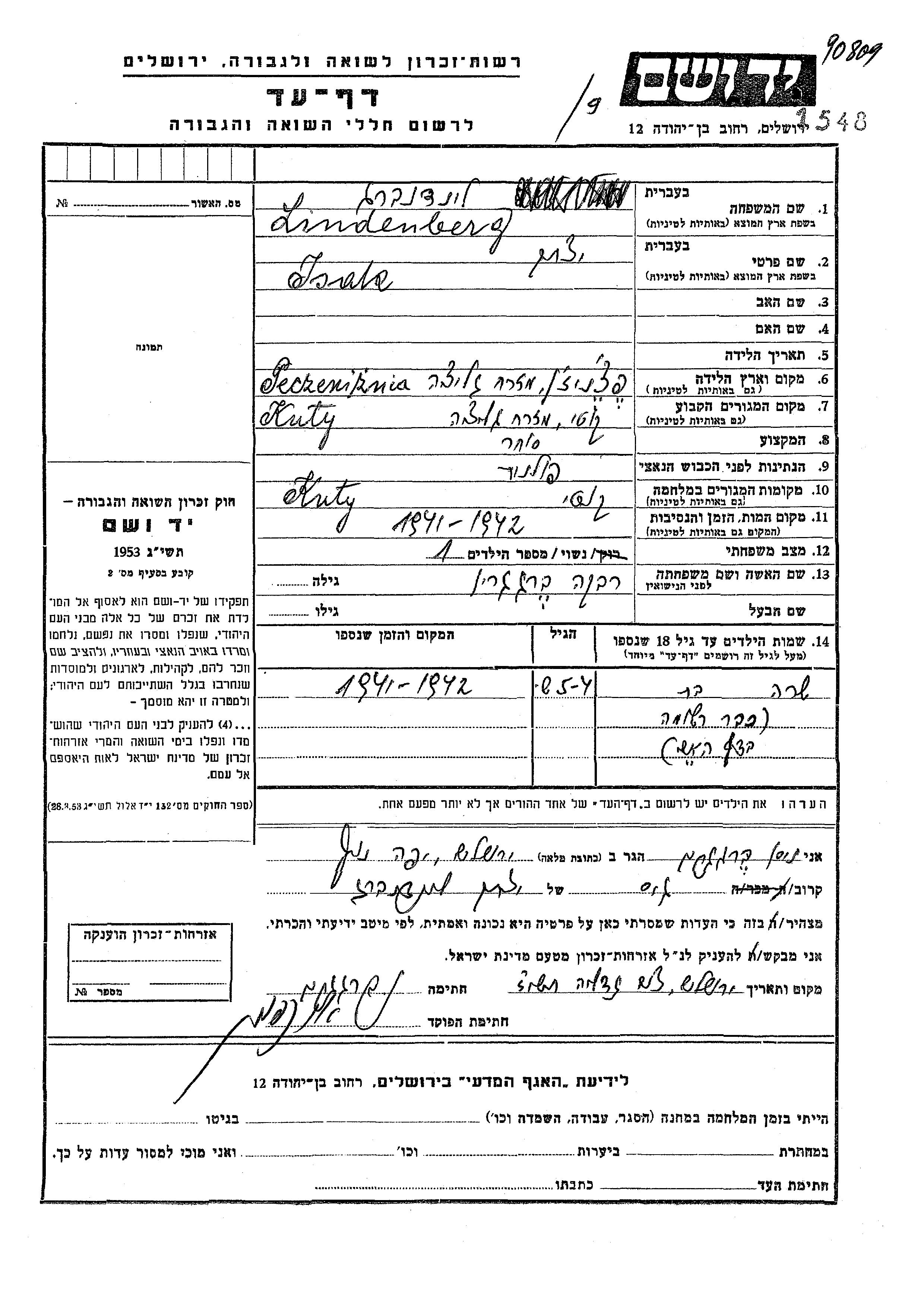 לינדנברג יצחק 1900 Kuty, פולין דף-עד