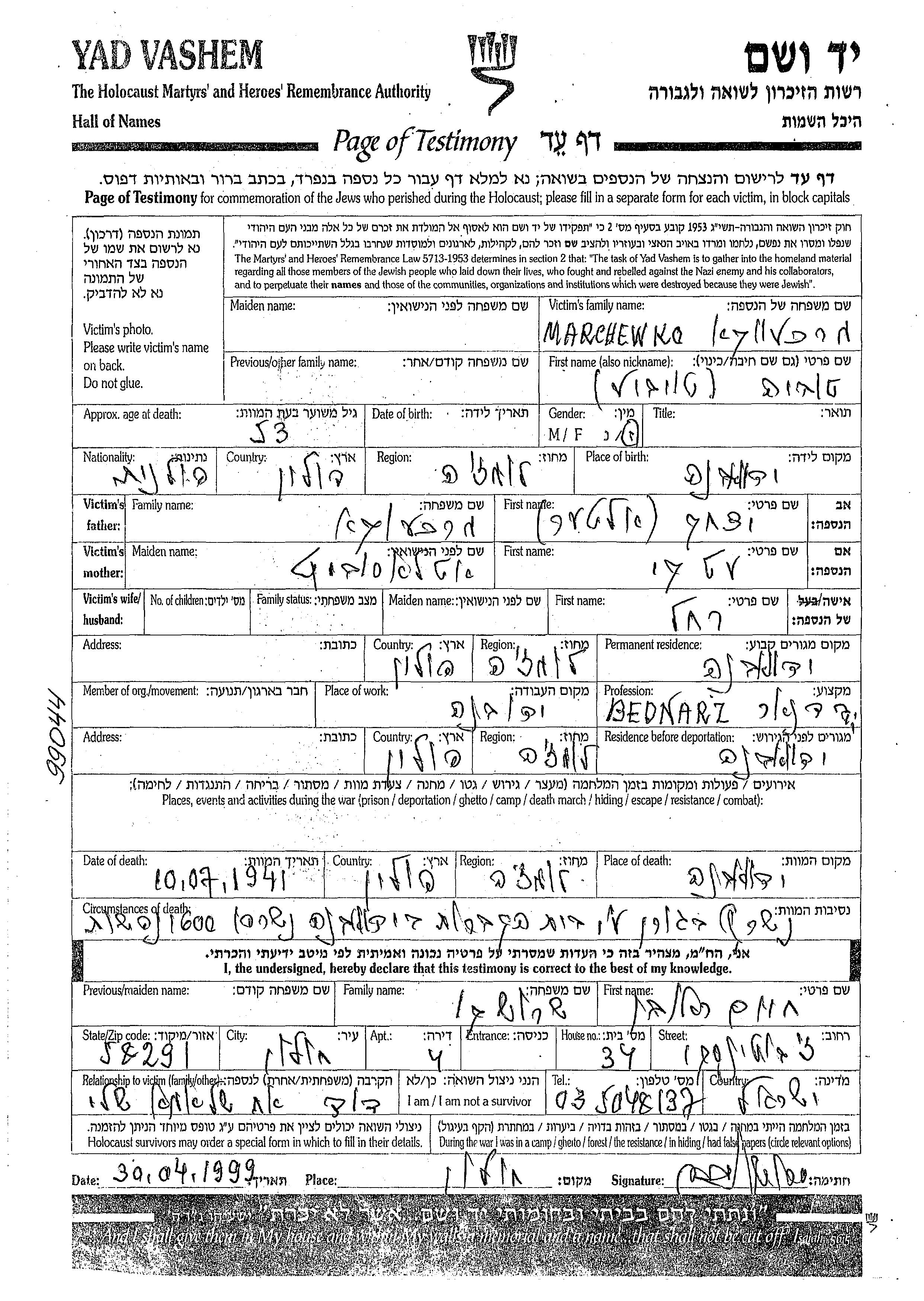 הוא נרצח בשואה. מקום המוות: מקום לא רשום בשנת 1941.