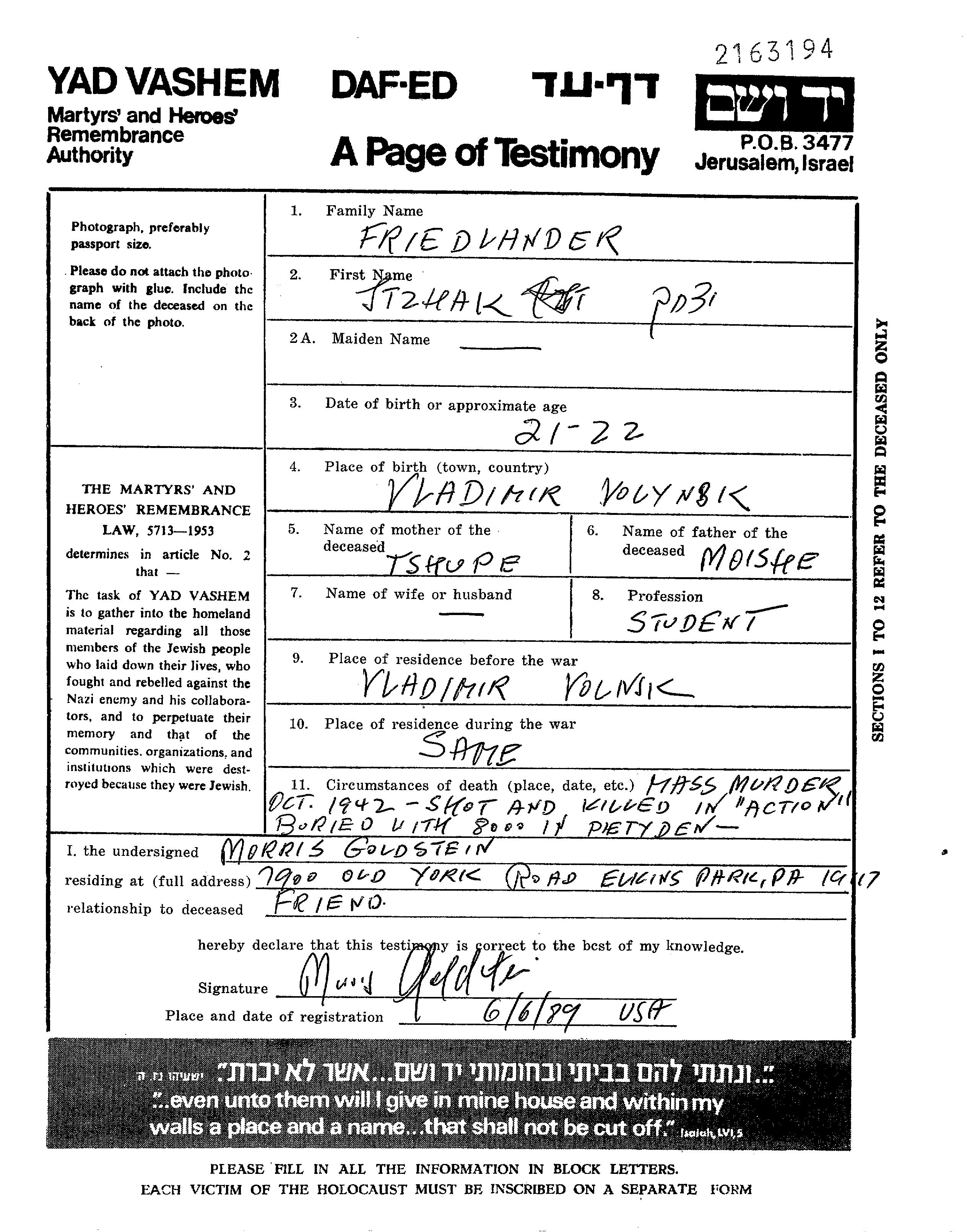 Icchak Friedlander נולד בWlodzimierz שבפולין בשנת 1918. לפני מלחמת העולם השניה התגורר בWlodzimierz שבפולין.