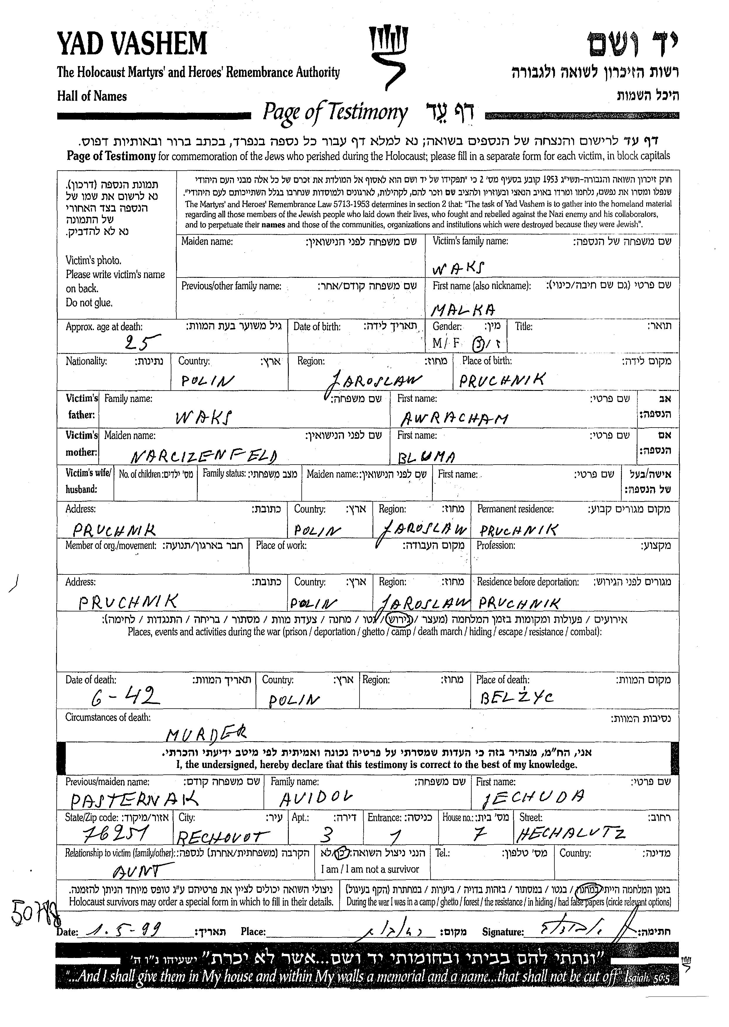 מלכה Waks נולדה בPruchnik שבפולין. לפני מלחמת העולם השניה התגוררה בPruchnik שבפולין.