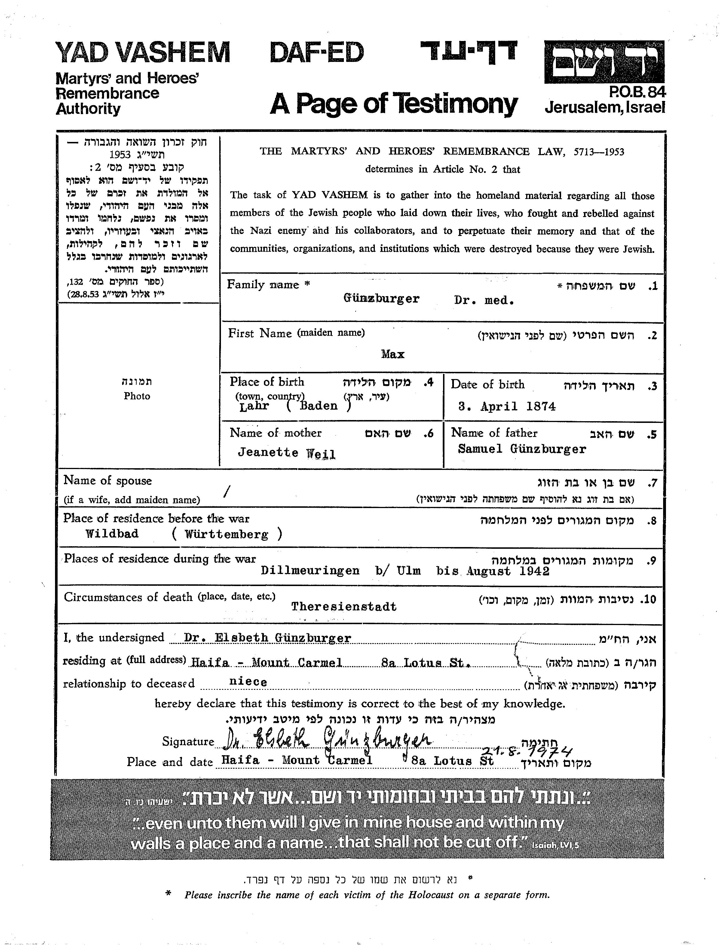 דר. לרפואה Günzburger נרצח בשואה. מקום המוות: Theresienstadt שבצ'כוסלובקיה.