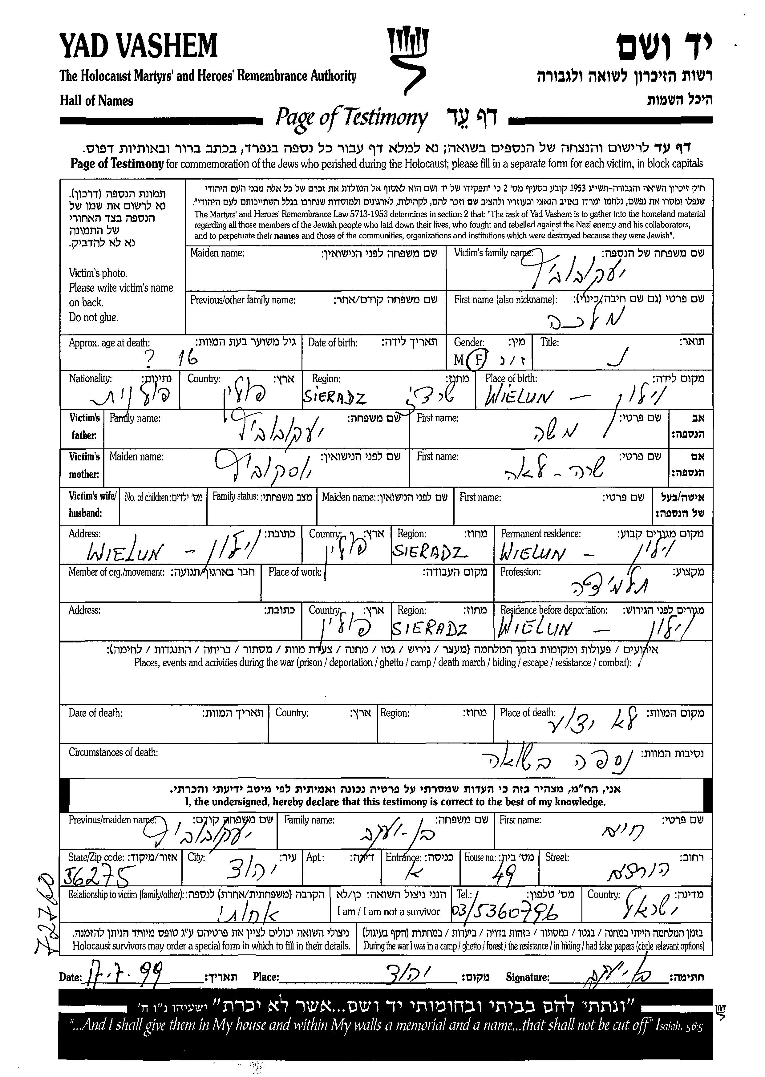 יעקובוביץ מלכה Wielun, פולין דף-עד