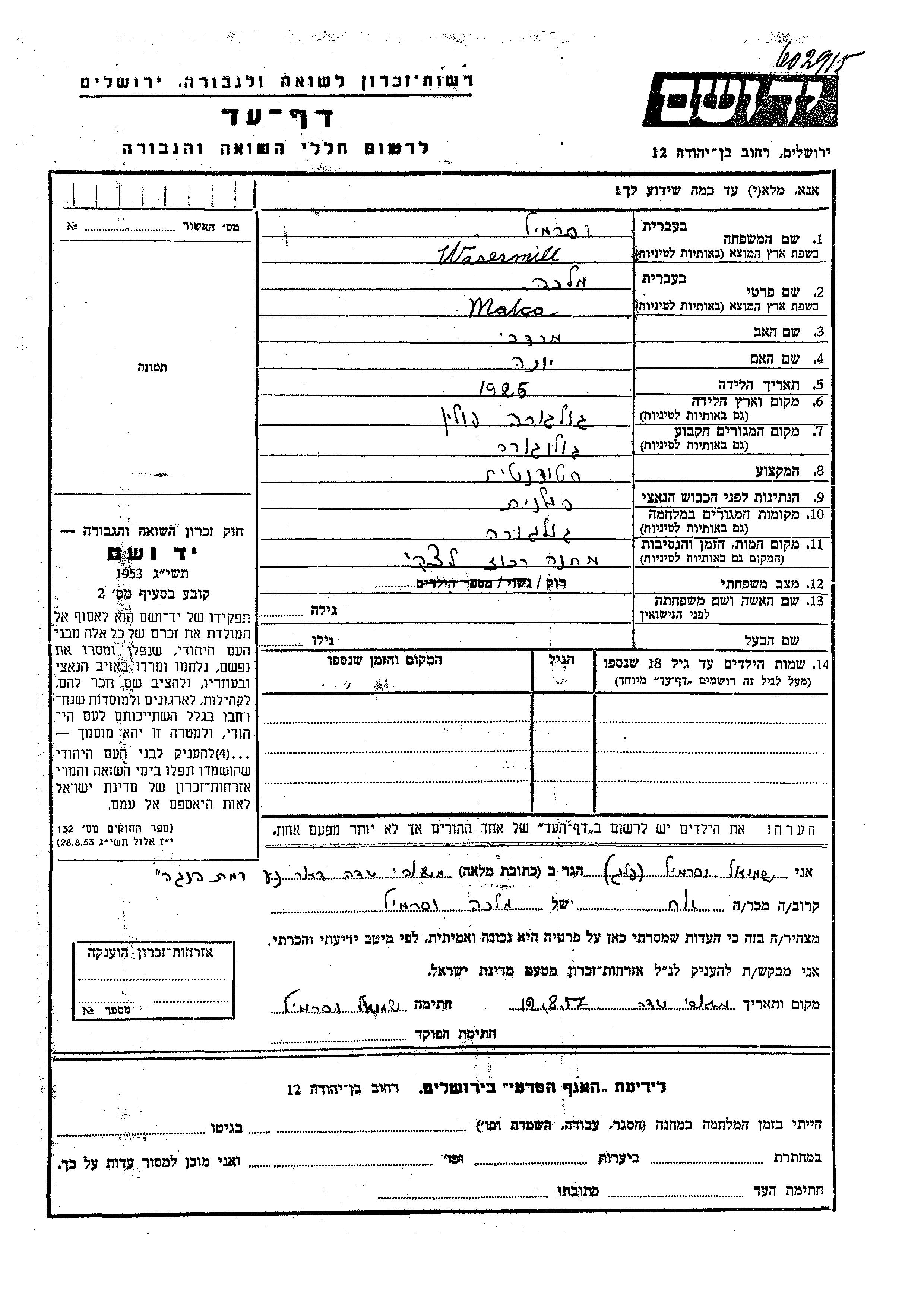 Malca אתל Wasermill נולדה בGologory שבפולין בשנת 1925. היא היתה סטודנטית. לפני מלחמת העולם השניה התגוררה בGologory שבפולין.