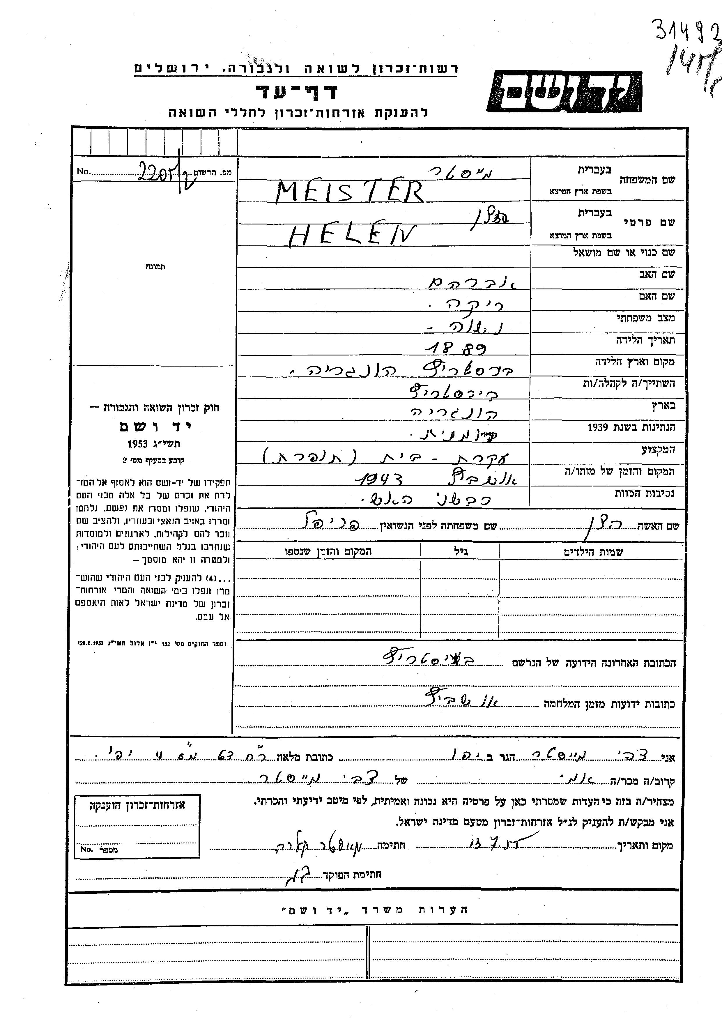 הלן נרצחה בשואה. מקום המוות: Auschwitz שבפולין בשנת 1943.