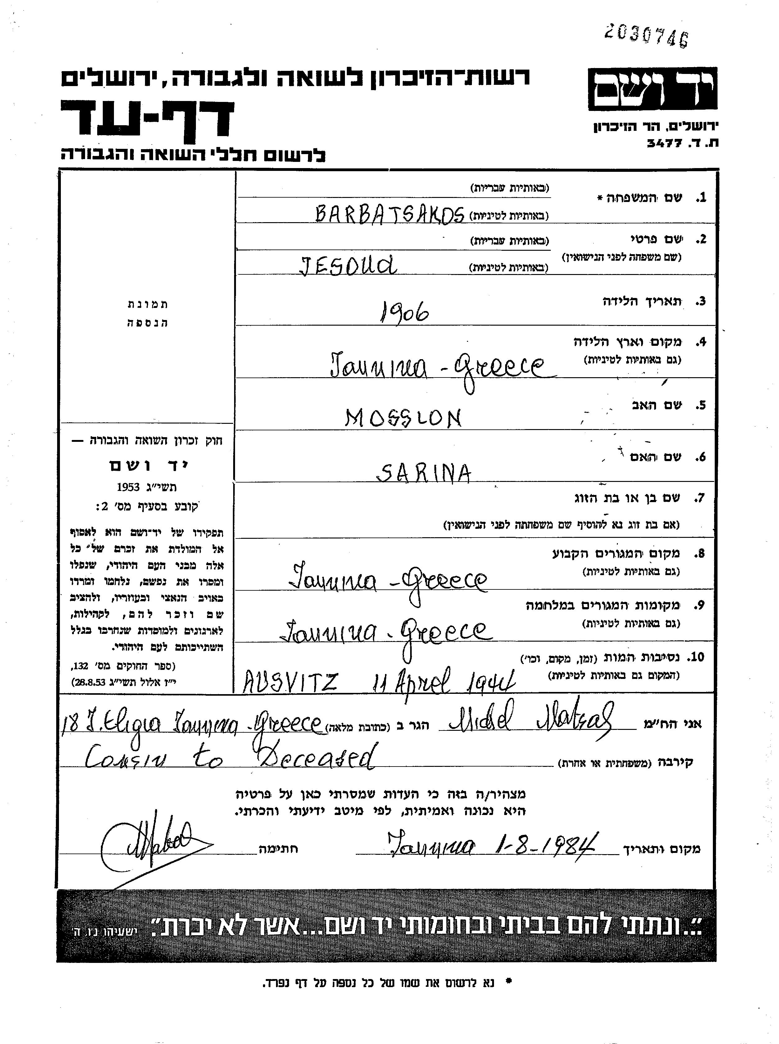 Barbatsakos Jesoua 1906 Janina, יון דף-עד