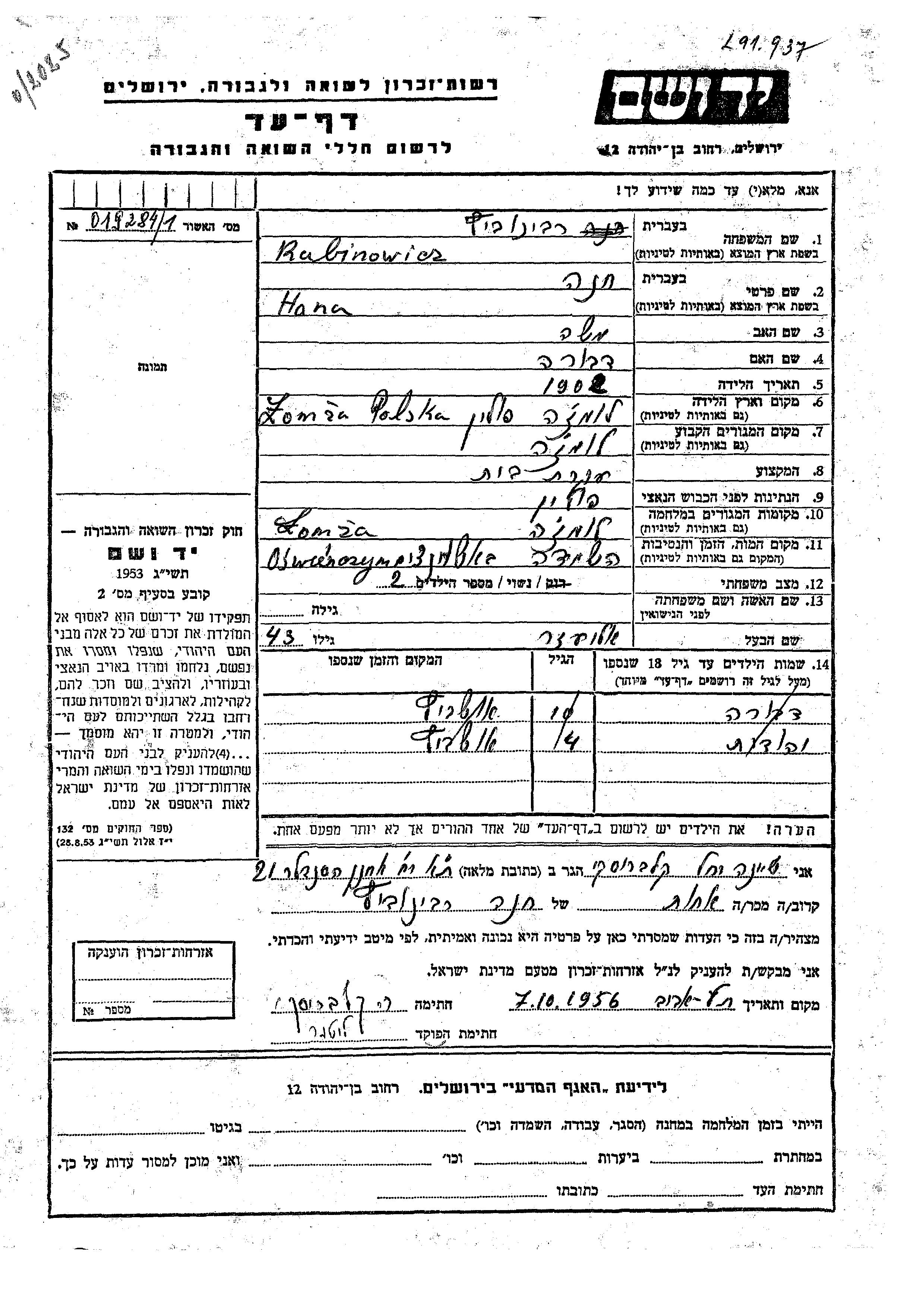 דבורה Rabinowicz. לפני מלחמת העולם השניה התגוררה בŁomża שבפולין.