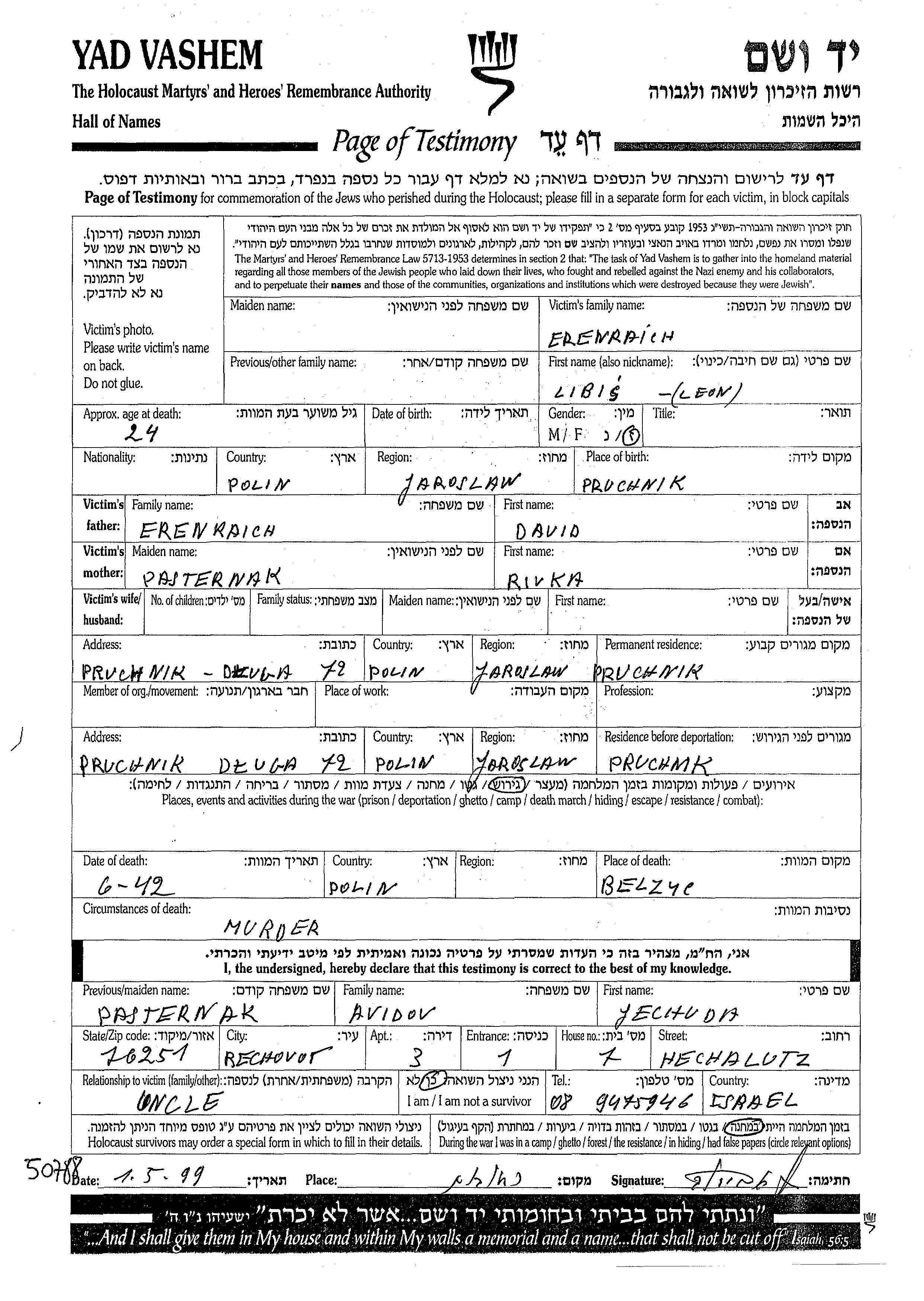 ליביס לאון יהודה Erenraich נולד בPruchnik שבפולין. הוא היה סנדלר. לפני מלחמת העולם השניה התגורר בPruchnik שבפולין.