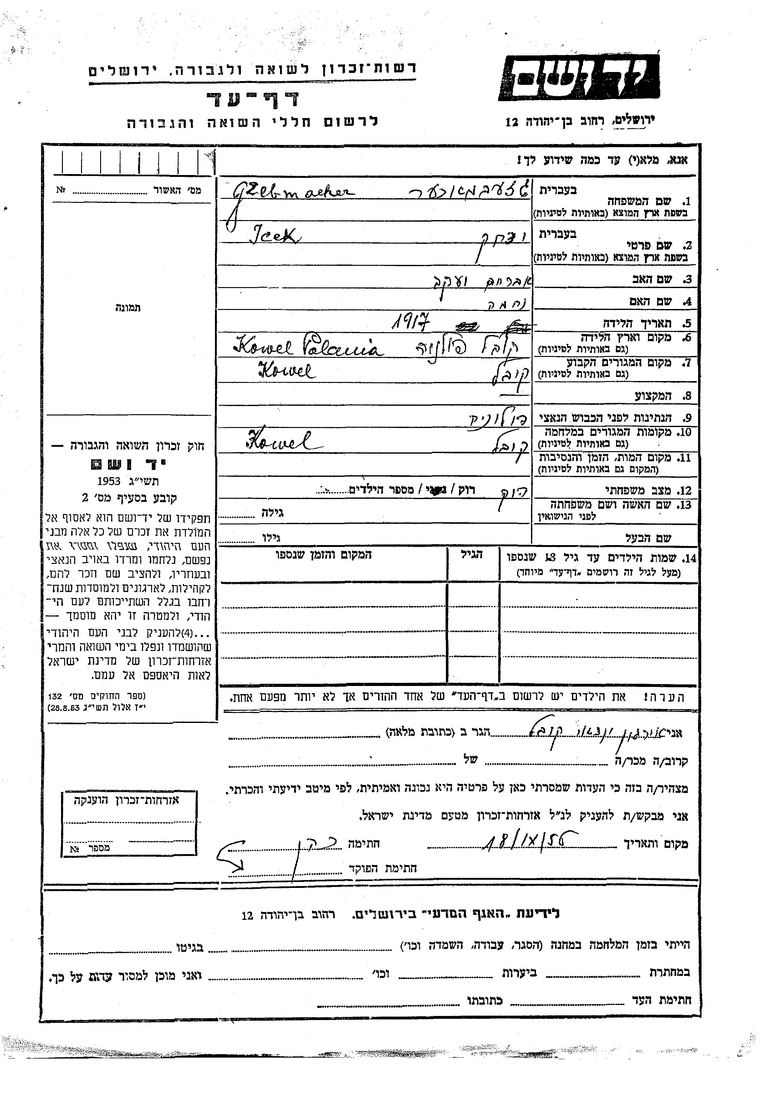 Icek Gzebmacher נולד בKowel שבפולין בשנת 1917. לפני מלחמת העולם השניה התגורר בKowel שבפולין.