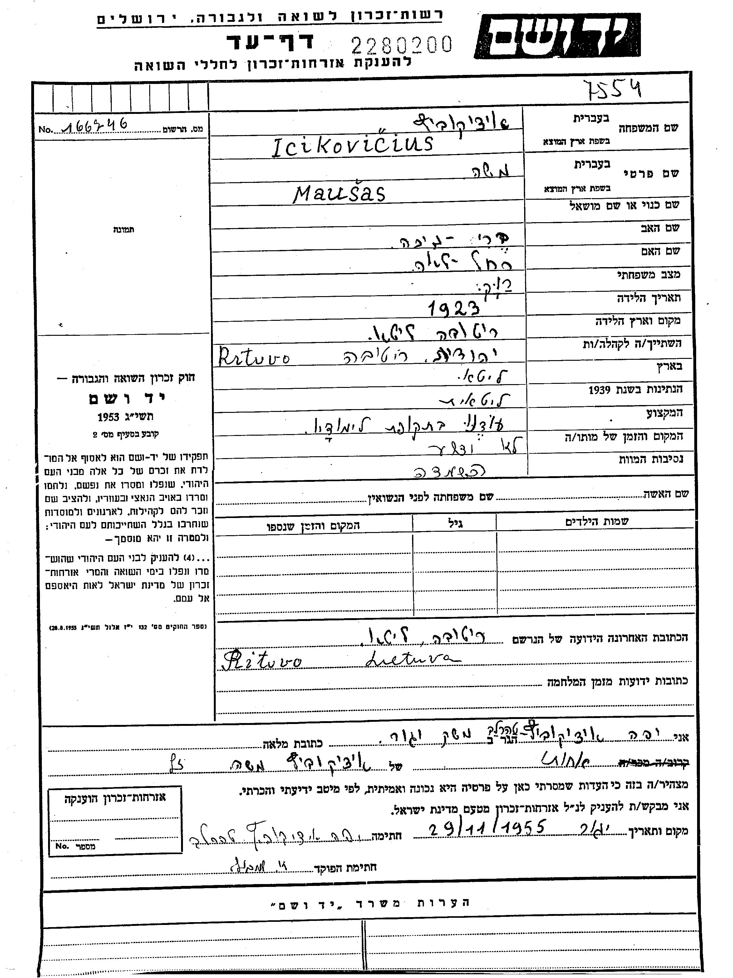 Mausas Icikovic נולד בRitova שבליטא בשנת 1923. הוא היה תלמיד. לפני מלחמת העולם השניה התגורר בRietavas שבליטא.
