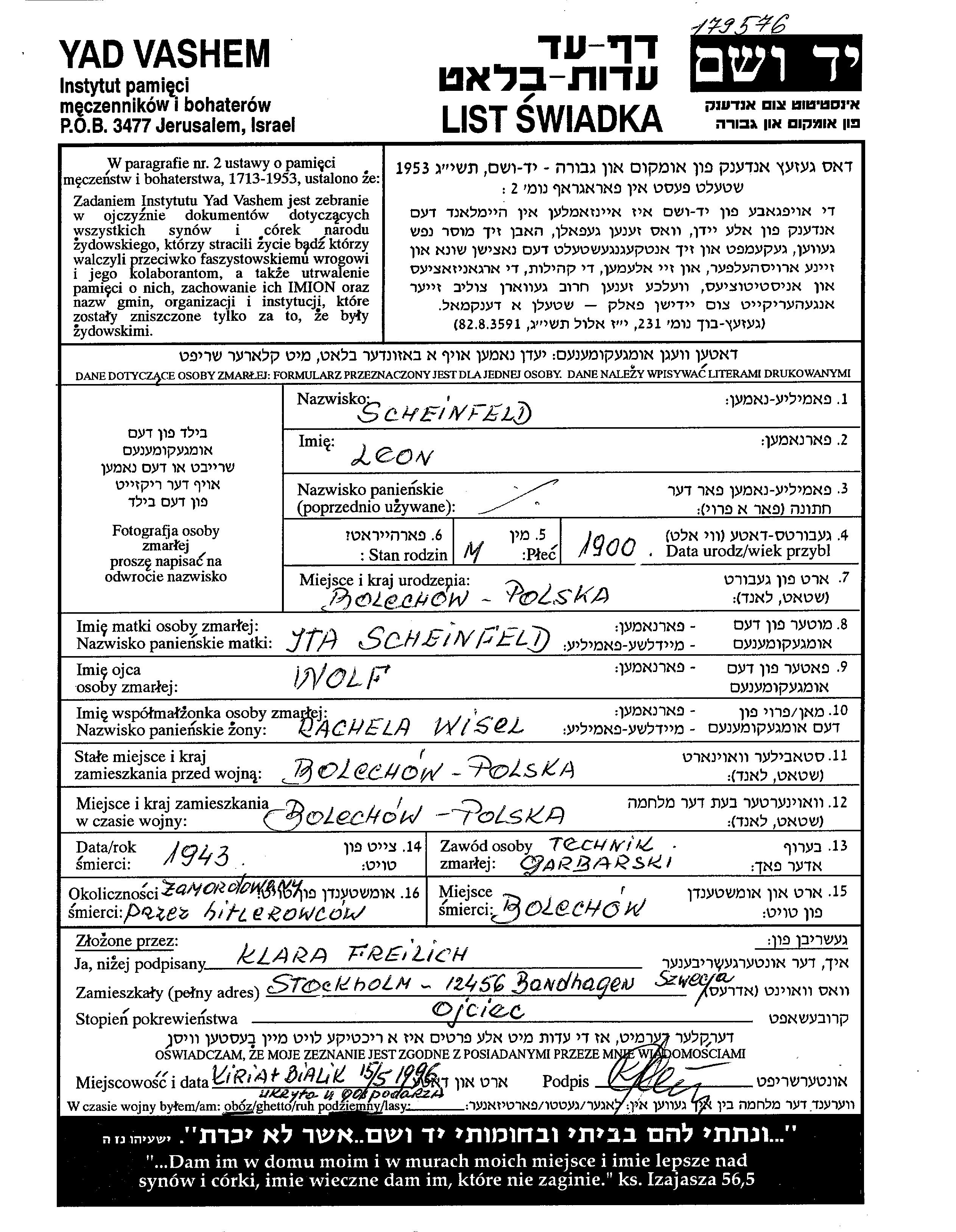 לאון Lajb Scheinfeld נולד בBolechow שבפולין בשנת 1900. הוא היה בורסקי. לפני מלחמת העולם השניה התגורר בBolechow שבפולין.