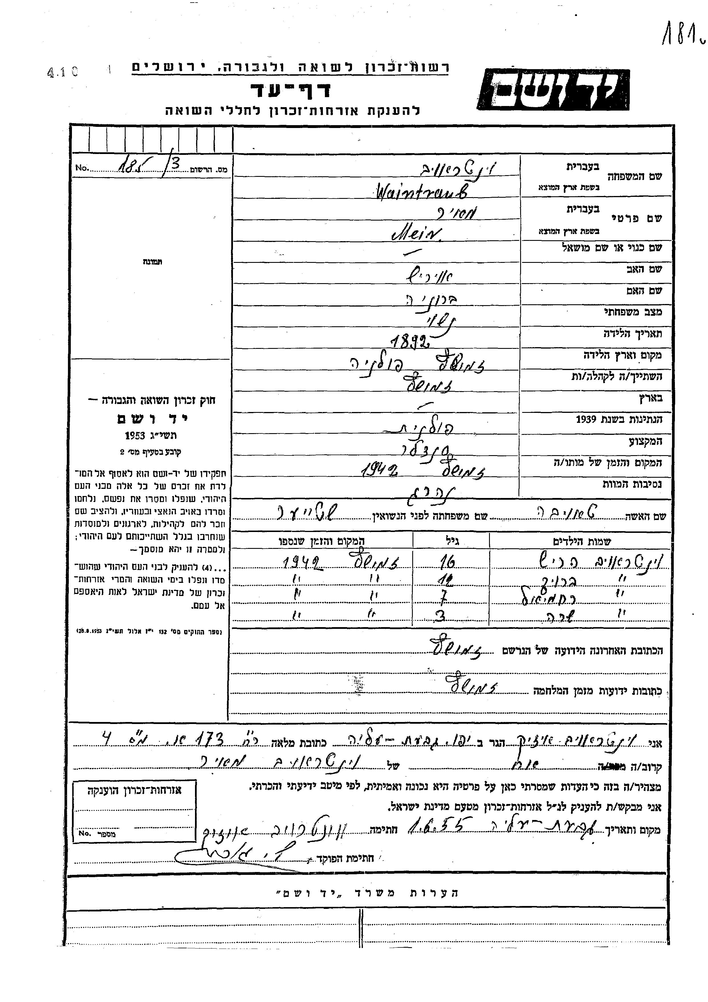 Waintraub מאיר 1892 Zamosc, פולין דף-עד