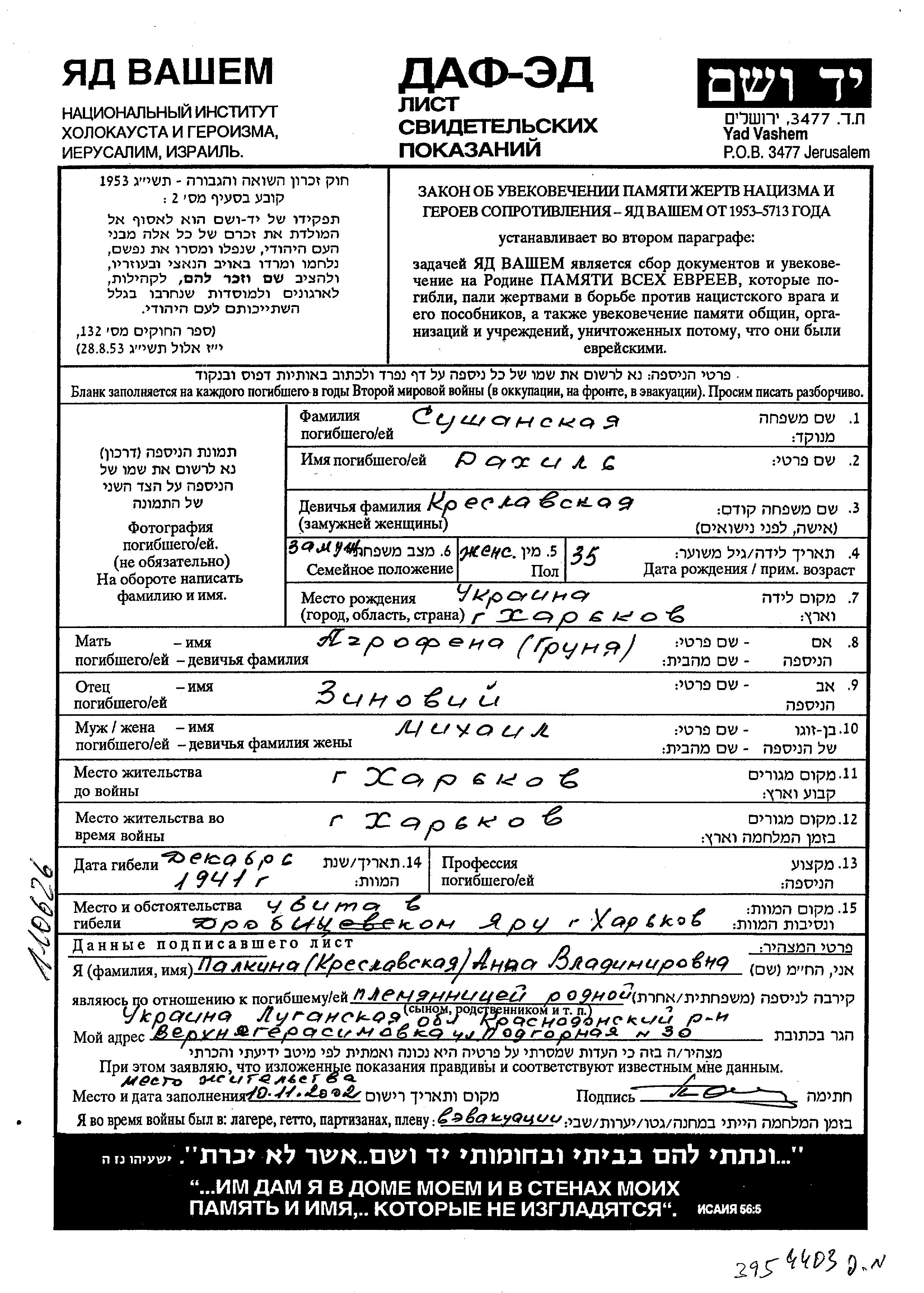 Sushanskaya | Rakhil | 1906 | Kharkov, אוקראינה (ברה"מ) | דף-עד |