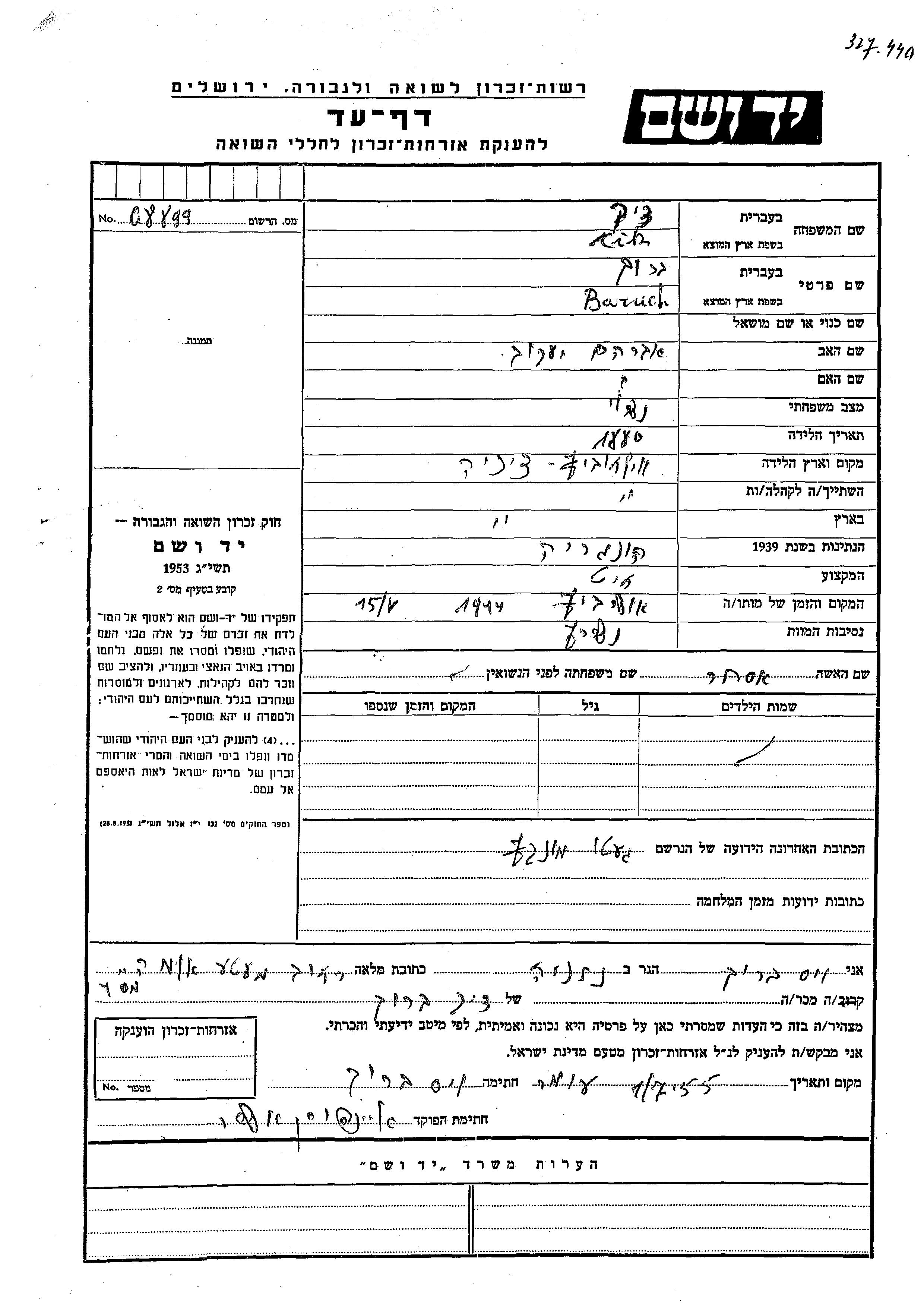 ברוך נרצח בשואה. מקום המוות: Auschwitz שבפולין בשנת 15/05/1944.