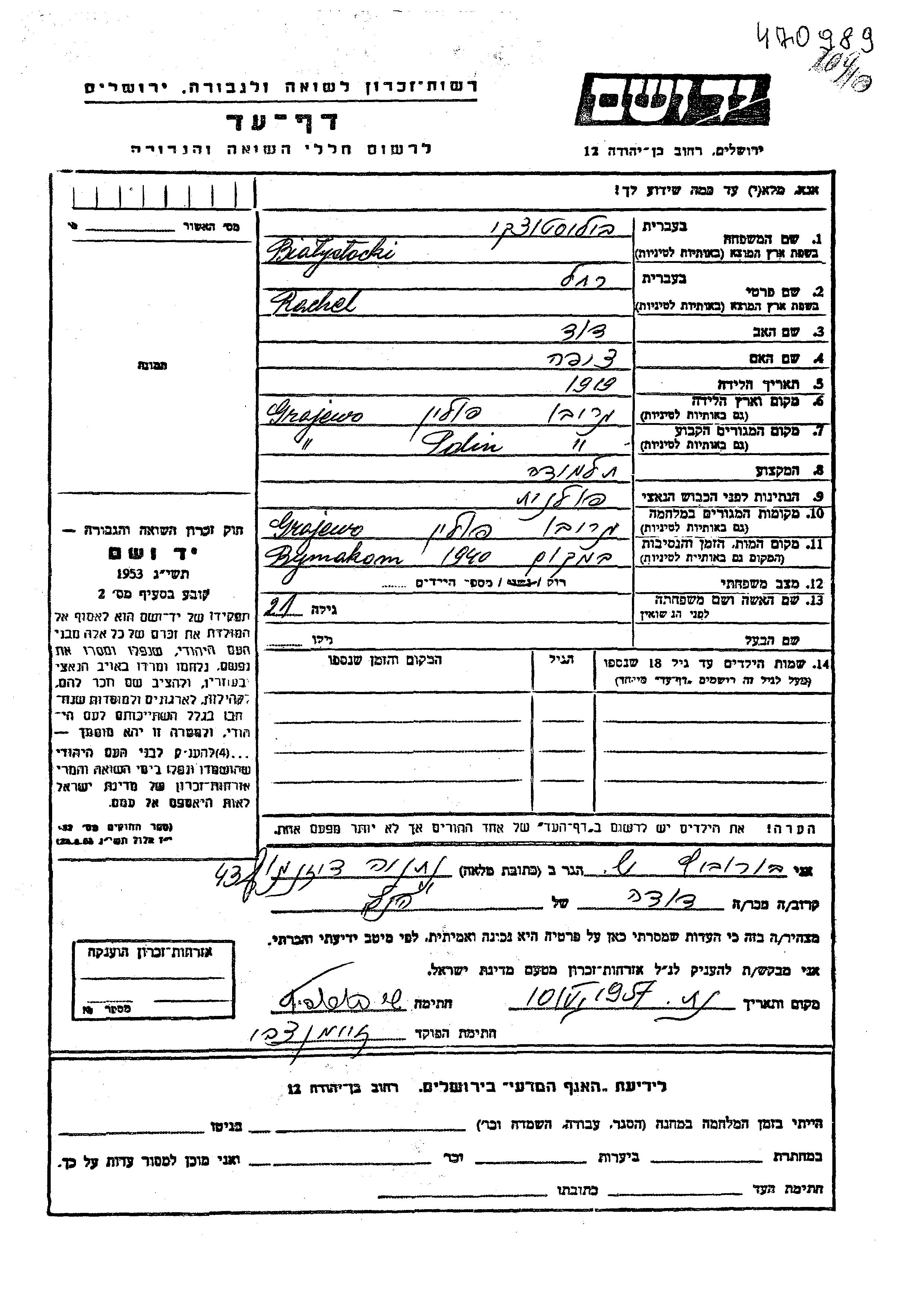 רחל Bialostocki נולדה בGrajewo שבפולין בשנת 1919. היא היתה תלמידה. לפני מלחמת העולם השניה התגוררה בGrajewo שבפולין.
