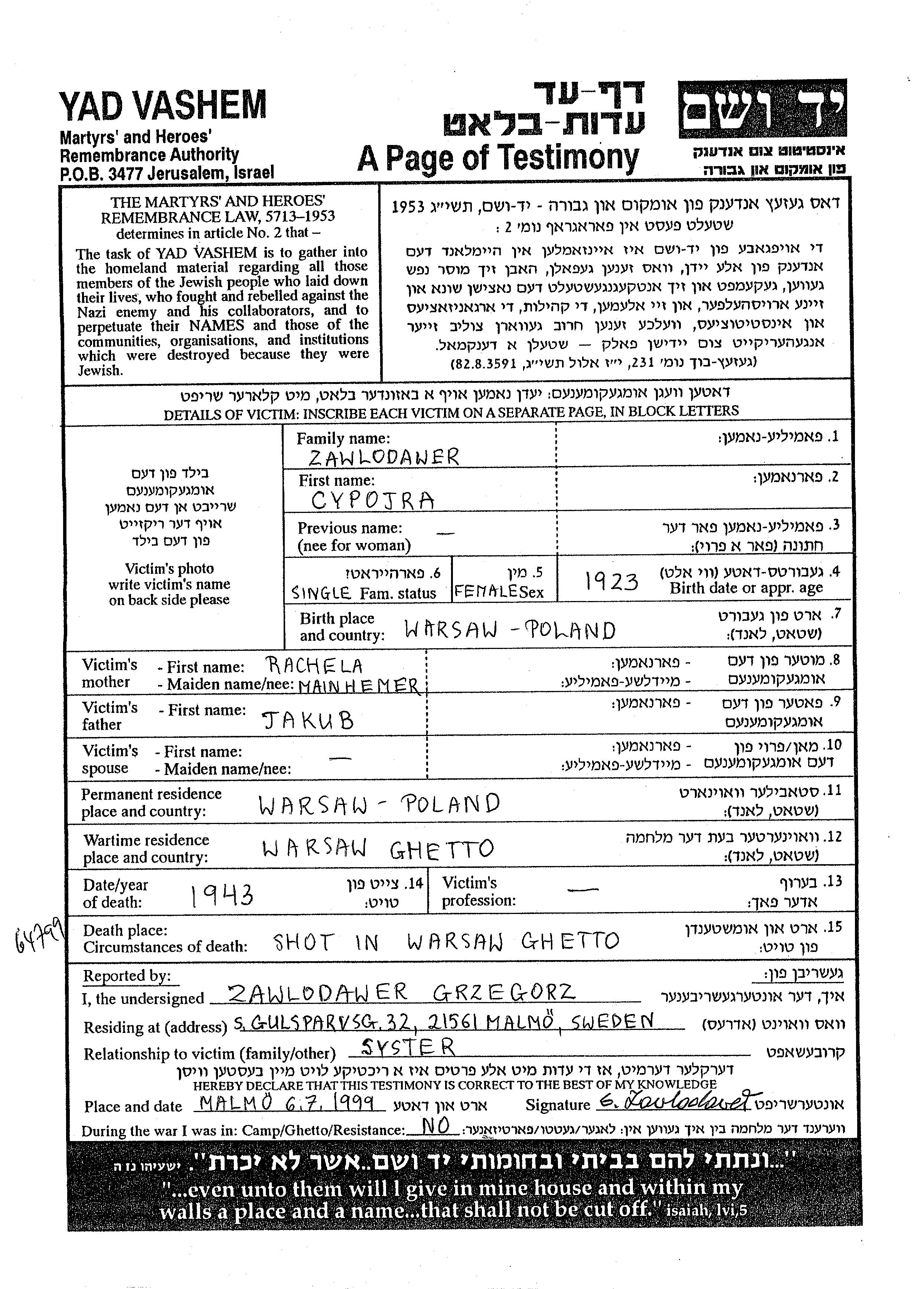 פאלטשע Cypojra נרצחה בשואה. מקום המוות: Warszawa שבפולין בשנת 1943.
