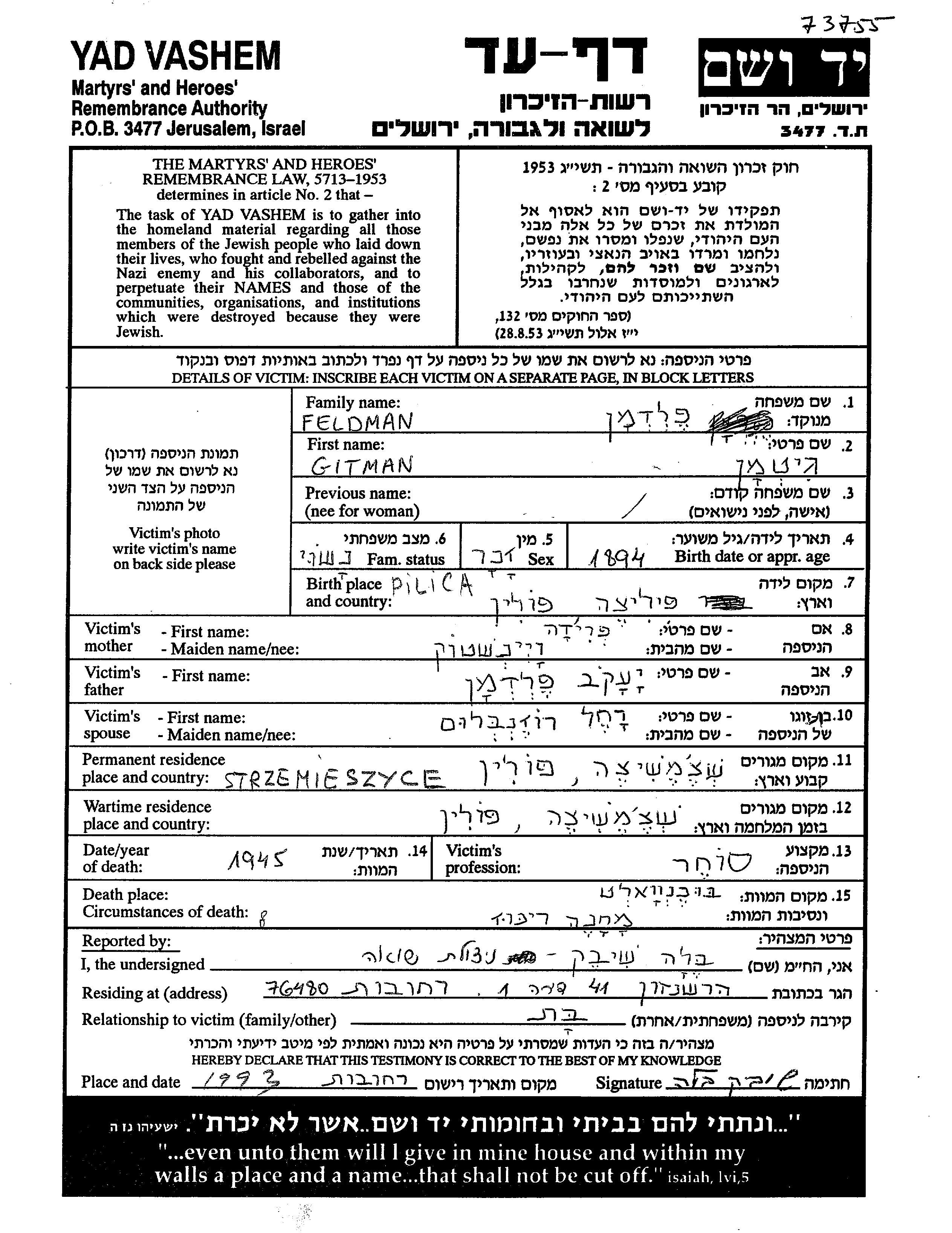 פלדמן גיטמה 1894 Strzemieszyce Wielkie, פולין דף-עד