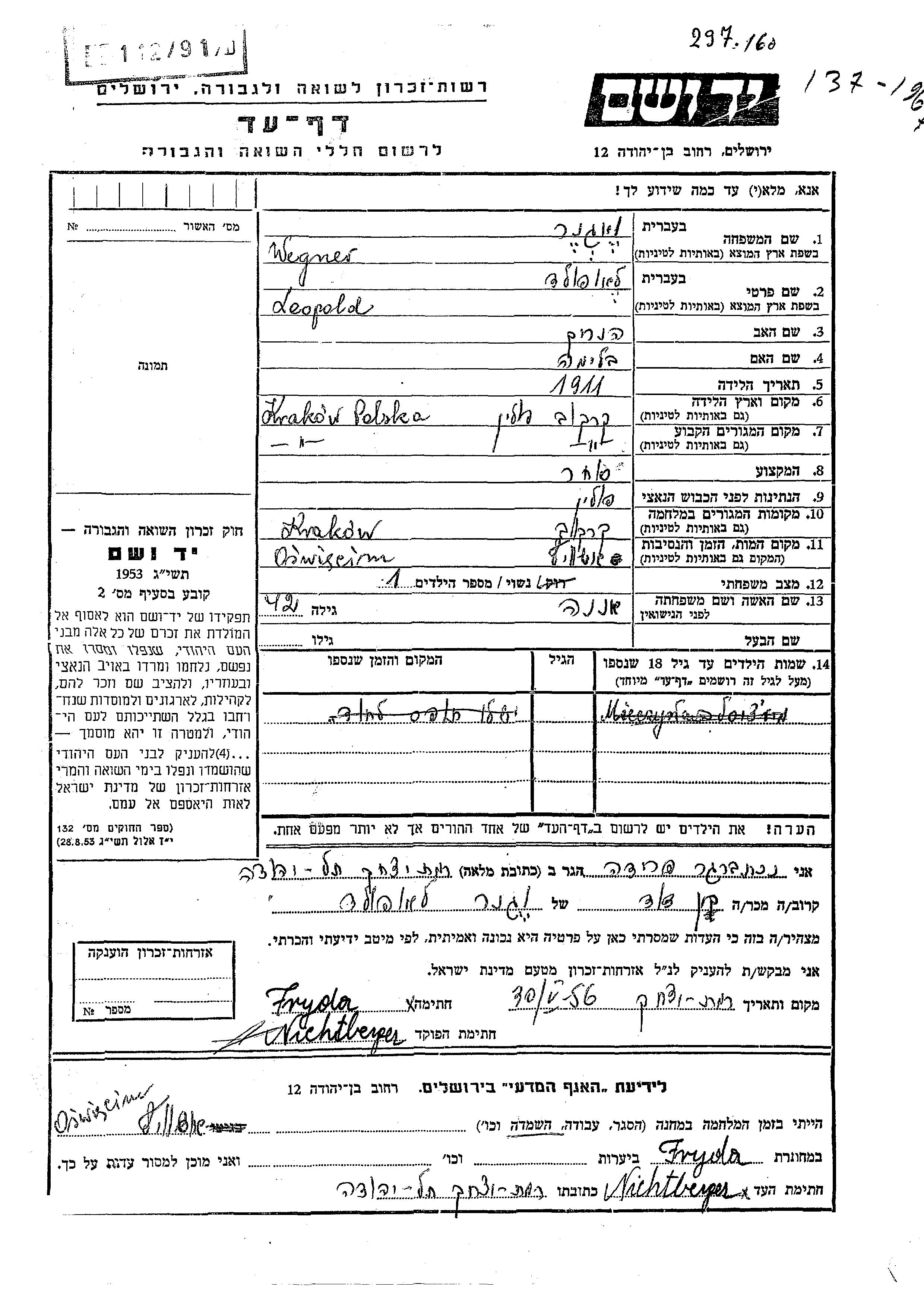 לאופולד Wegner נולד בKrakow שבפולין בשנת 1911 להנריך ובלימה. הוא היה סוחר ונשוי לאננה. לפני מלחמת העולם השניה התגורר בKrakow שבפולין. בזמן המלחמה הוא היה בKrakow שבפולין.