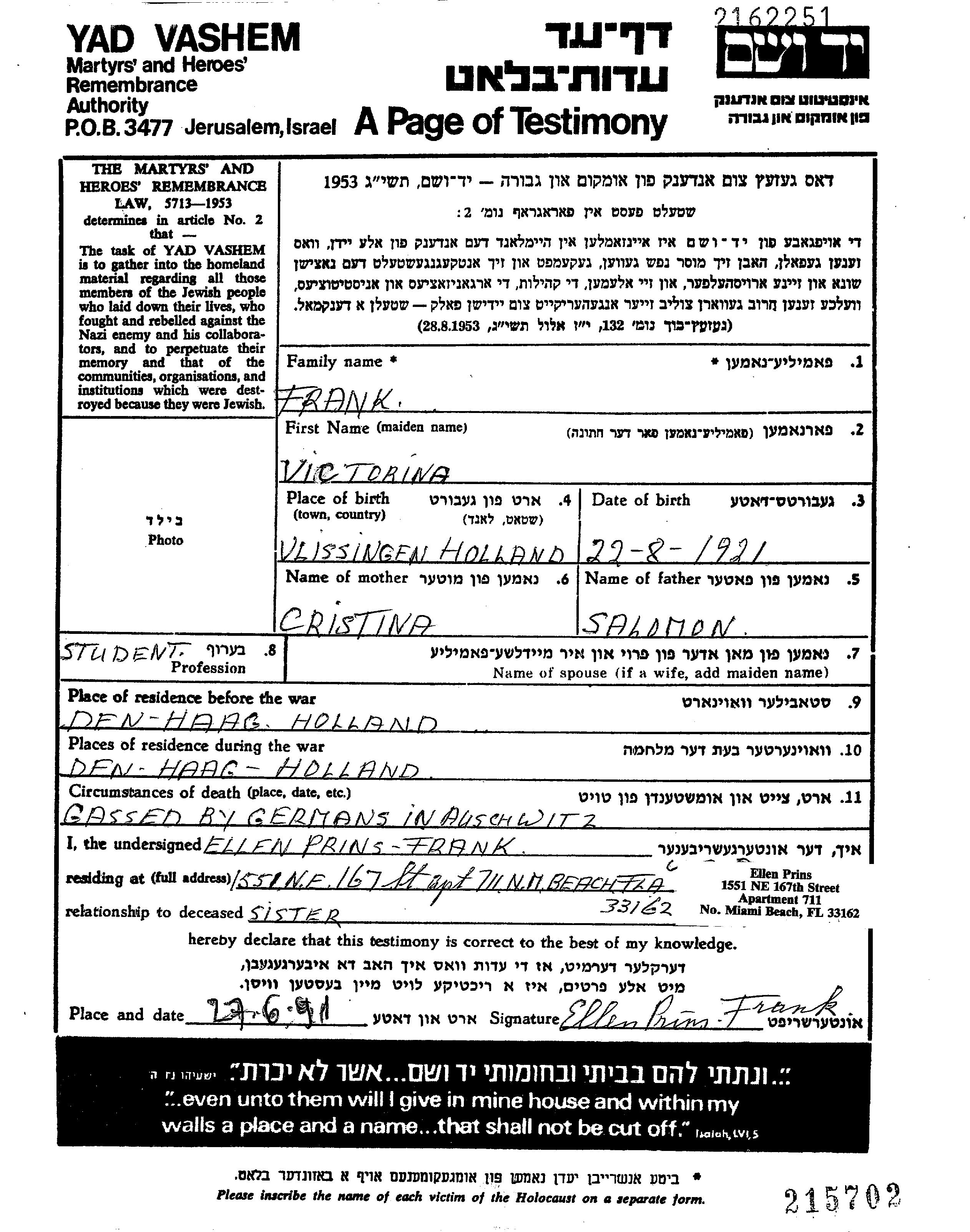 פרנק Victorine 1921 Vlissingen, הולנד רשימת יהודים נרצחים מהולנד