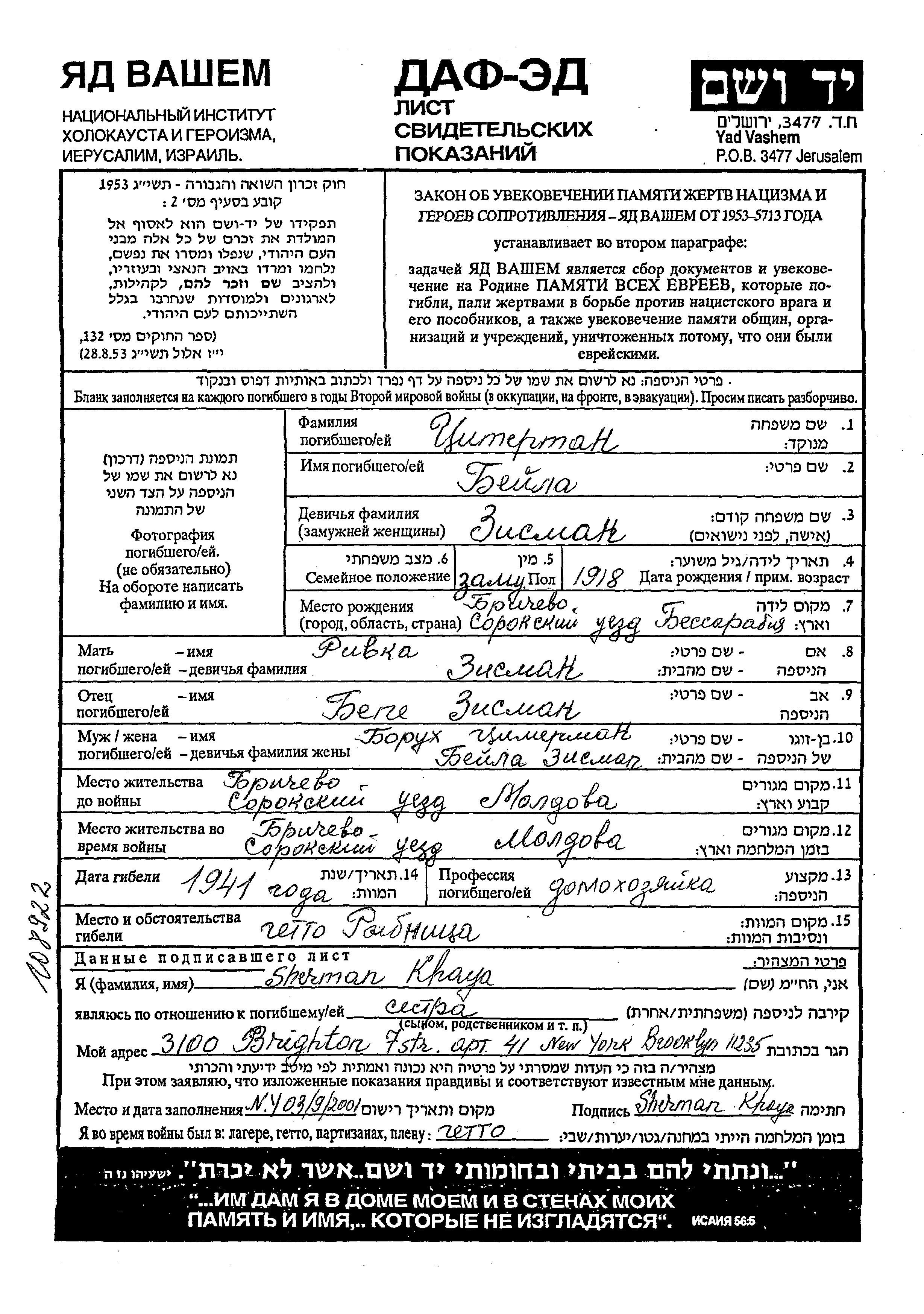 | ציטרמן צימרמן | Beila | 1918 | Brichevo, רומניה | דף-עד |