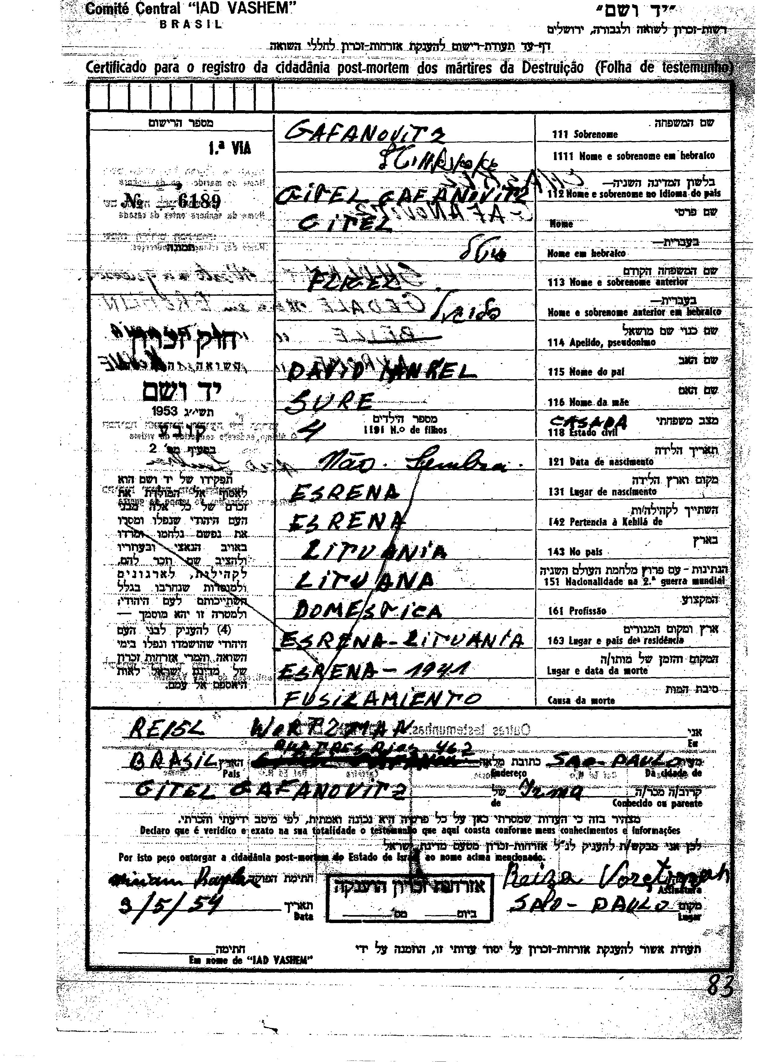 גיטל נרצחה בשואה. מקום המוות: Esrena שבליטא בשנת 1941.