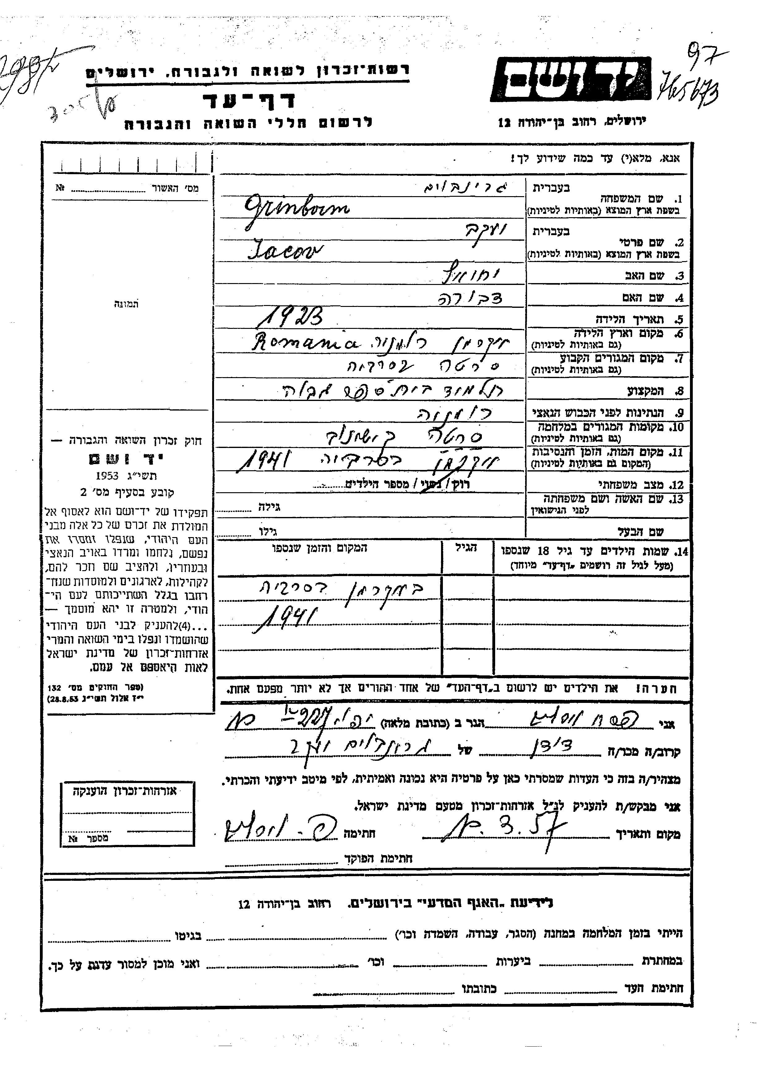 Jacov גרינבום נולד בAkerman שברומניה בשנת 1923. הוא היה תלמיד בית ספר גבוה. לפני מלחמת העולם השניה התגורר בSarata שברומניה.