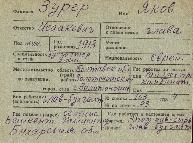 כרטסת של יהודים תושבי ברית המועצות שפונו ל- Tashkent ומשם למקומות שונים באוזבקיסטן , פברואר 1942