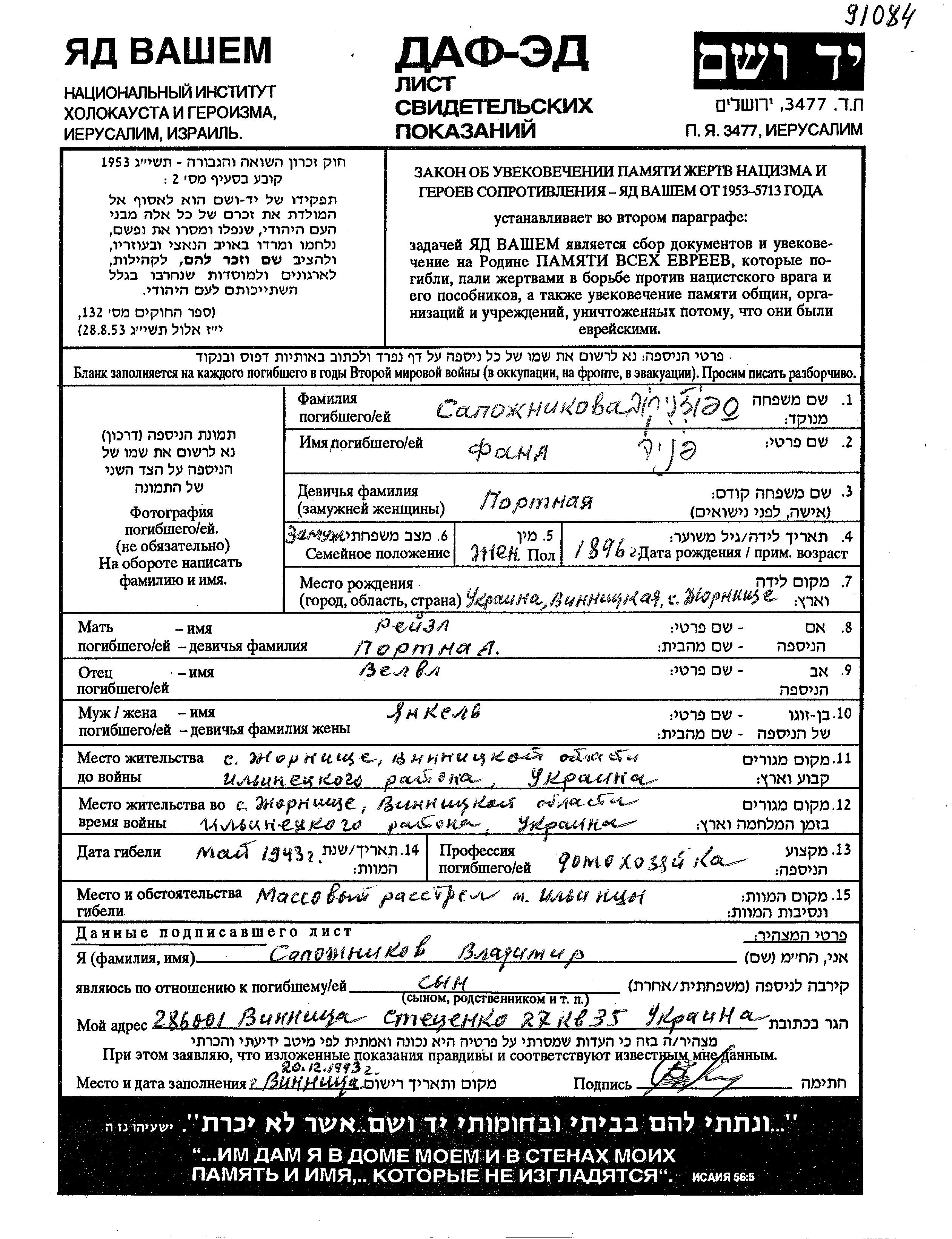 פניה נרצחה בשואה. מקום המוות: Ilyintsy שבאוקראינה (ברה"מ) בשנת 27/05/1942.