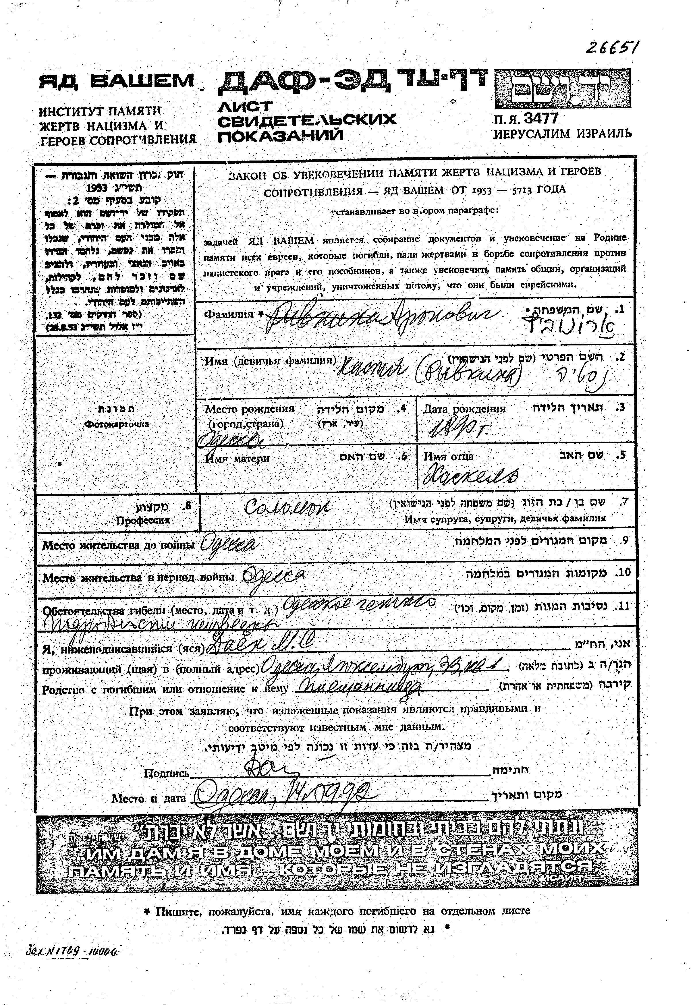 היא נרצחה בשואה. מקום המוות: Odessa שבאוקראינה (ברה"מ).
