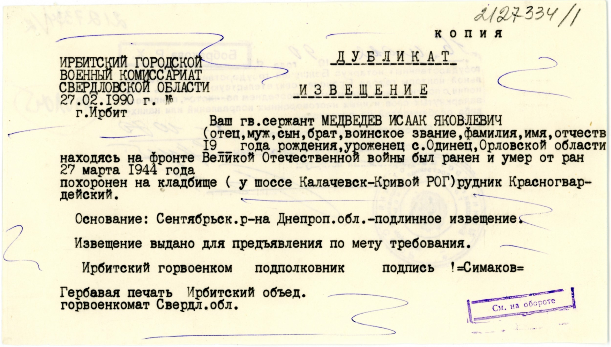 הוא נהרג בשירות צבאי. מקום המוות: רוסיה (ברה"מ) בשנת 27/03/1944.