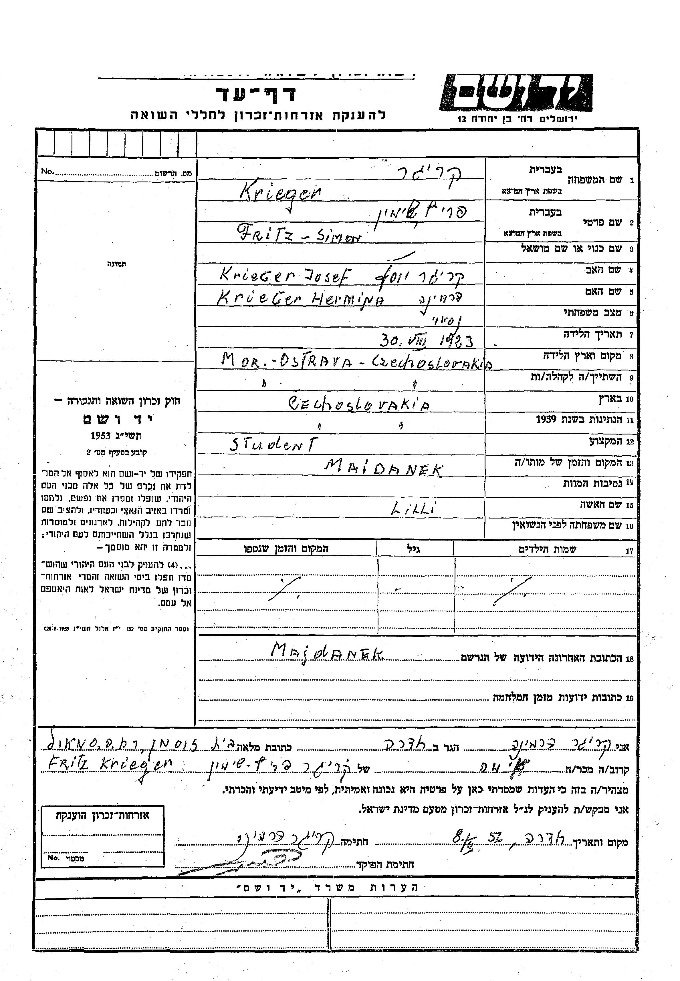 Fritz שימון Krieger נולד בOstrava שבצ'כוסלובקיה בשנת 1923. הוא היה תלמיד. לפני מלחמת העולם השניה התגורר בMoravska Ostrava שבצ'כוסלובקיה.