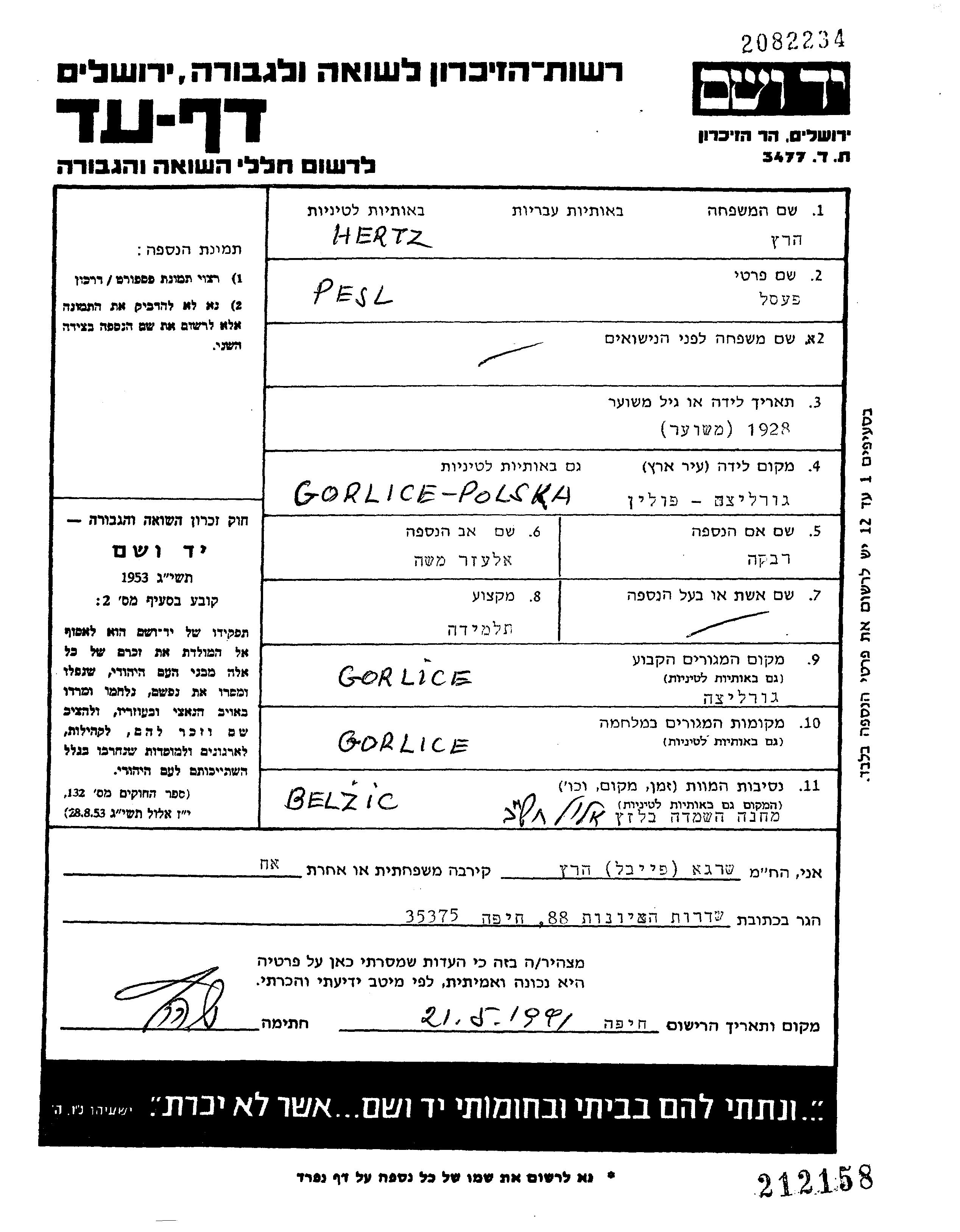הרץ Pesl פסל Gorlice, פולין דף-עד