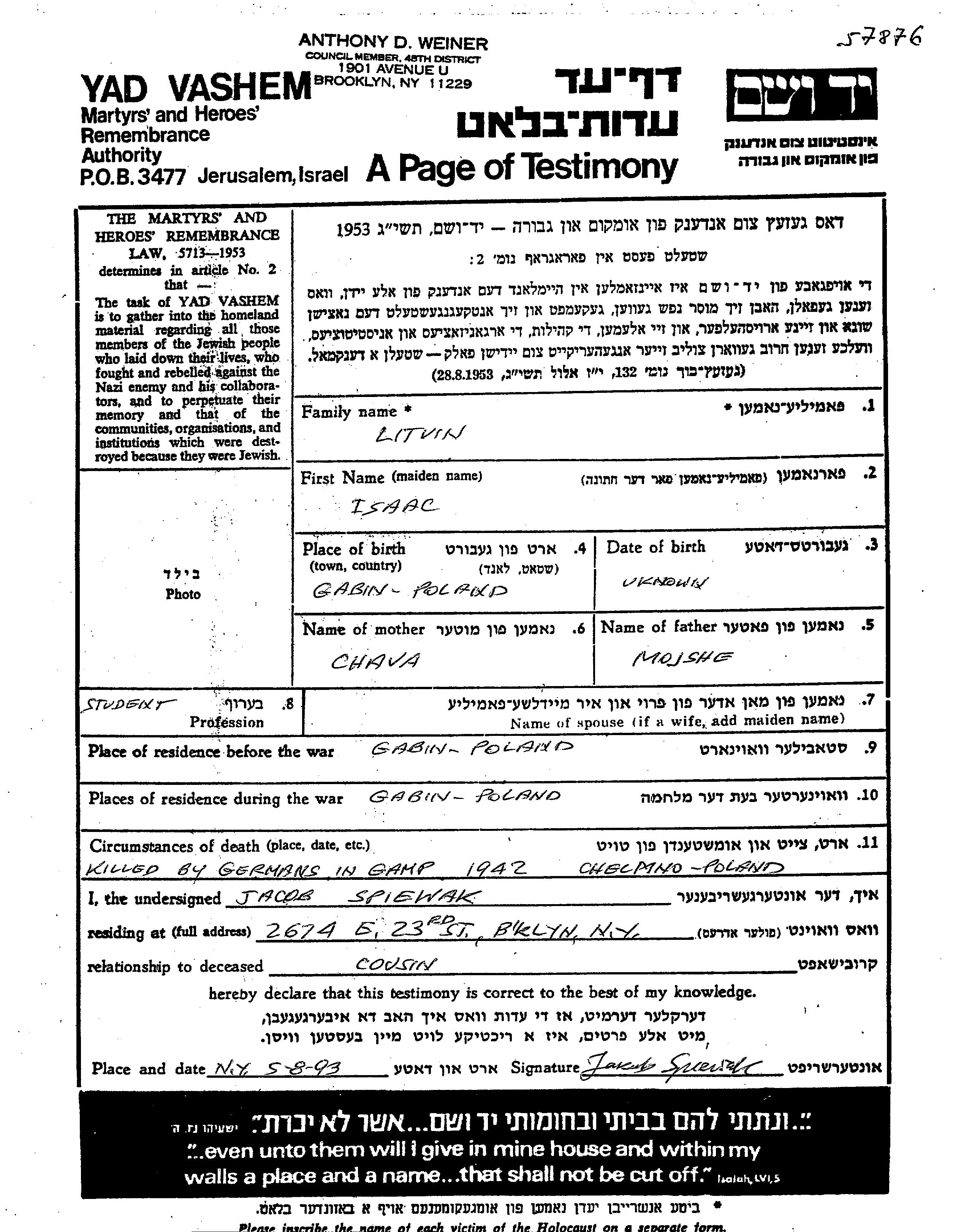 Isaac ליטוין נולד בGabin שבפולין. הוא היה סטודנט. לפני מלחמת העולם השניה התגורר בGabin שבפולין.