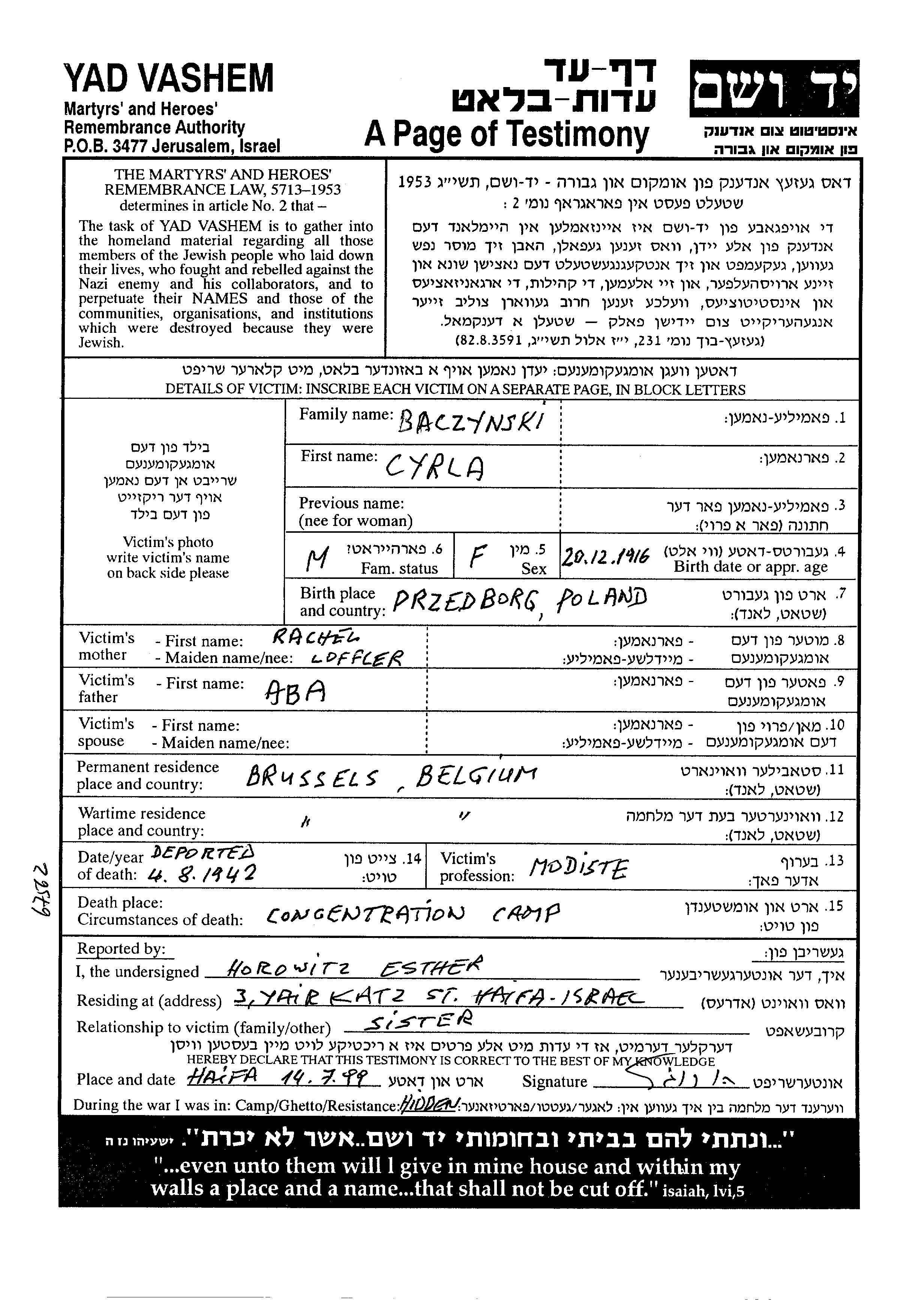 Cyrla Baczynski נולדה בPrzedborz שבפולין בשנת 1916. לפני מלחמת העולם השניה התגוררה בBruxelles שבבלגיה.