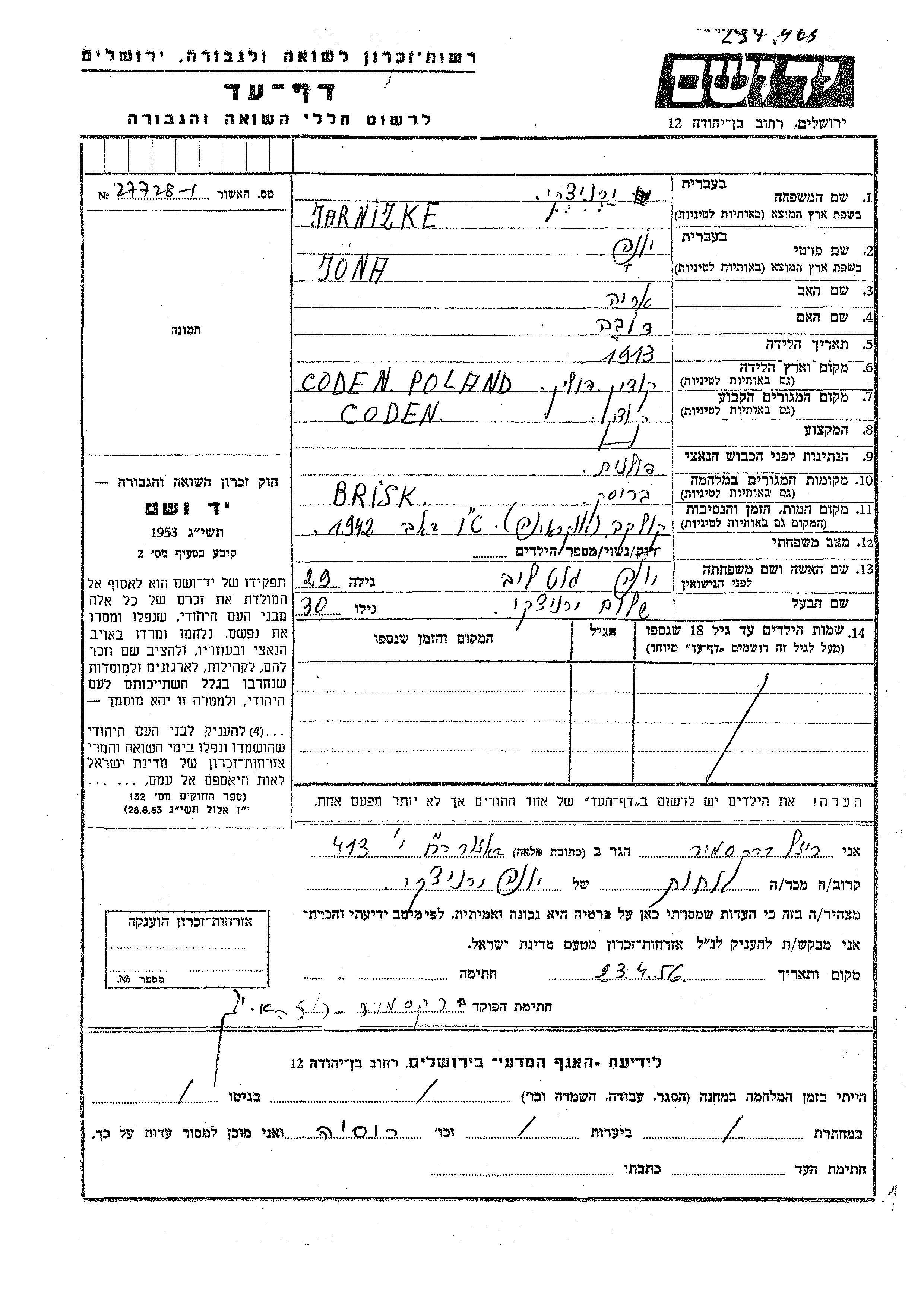 Jona Jarnizke נולד בCoden שבפולין בשנת 1913 לאריה ודובה. הוא היה נשוי לשלום לבית גוטליב. לפני מלחמת העולם השניה התגורר בCoden שבפולין. בזמן המלחמה הוא היה בBrisk שבפולין. הוא נרצח בשואה. מקום המוות: Kołki שבפולין בשנת 1942.