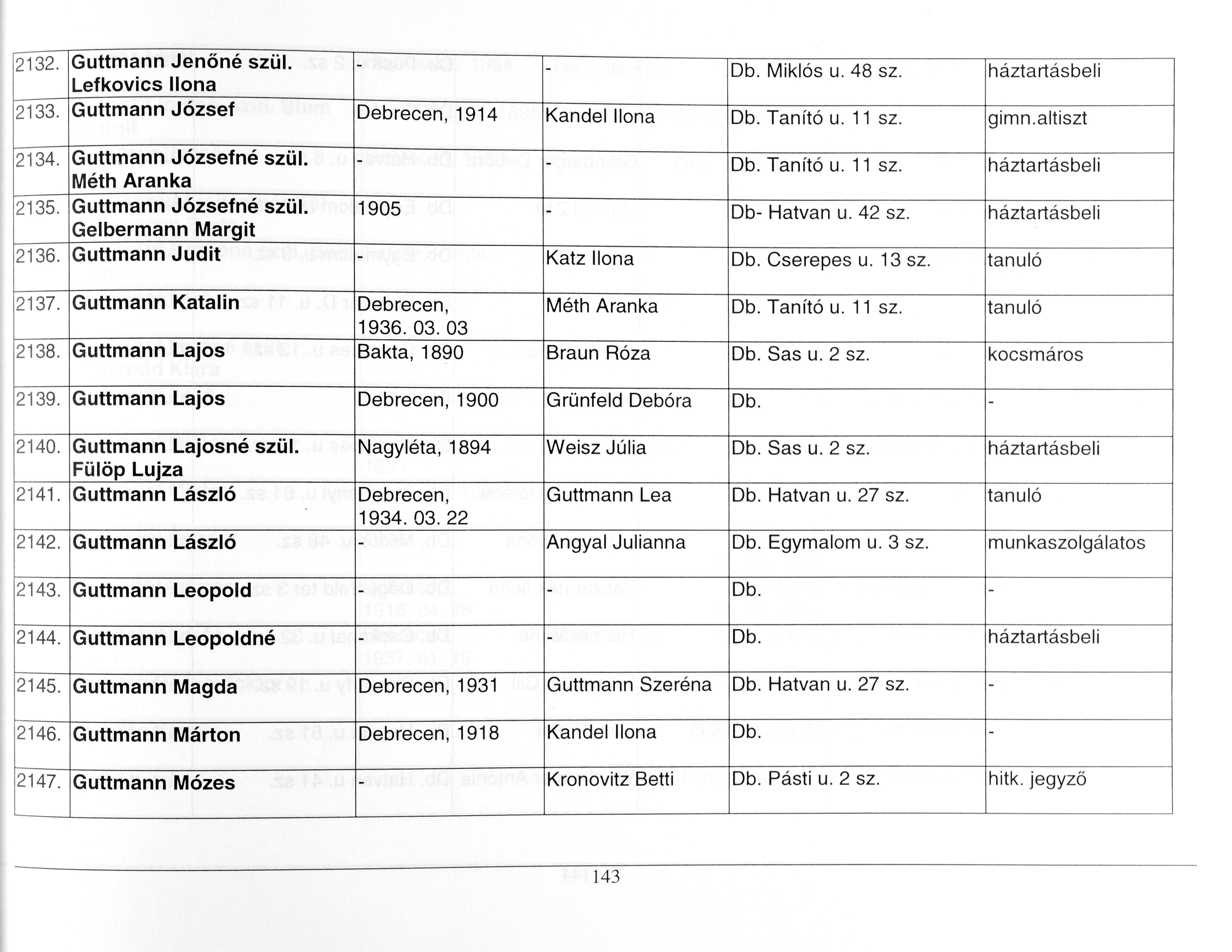 רשימת יהודים מ-Debrecen שנרצחו בשואה ויהודים שניצלו, מתוך ספר זכרון