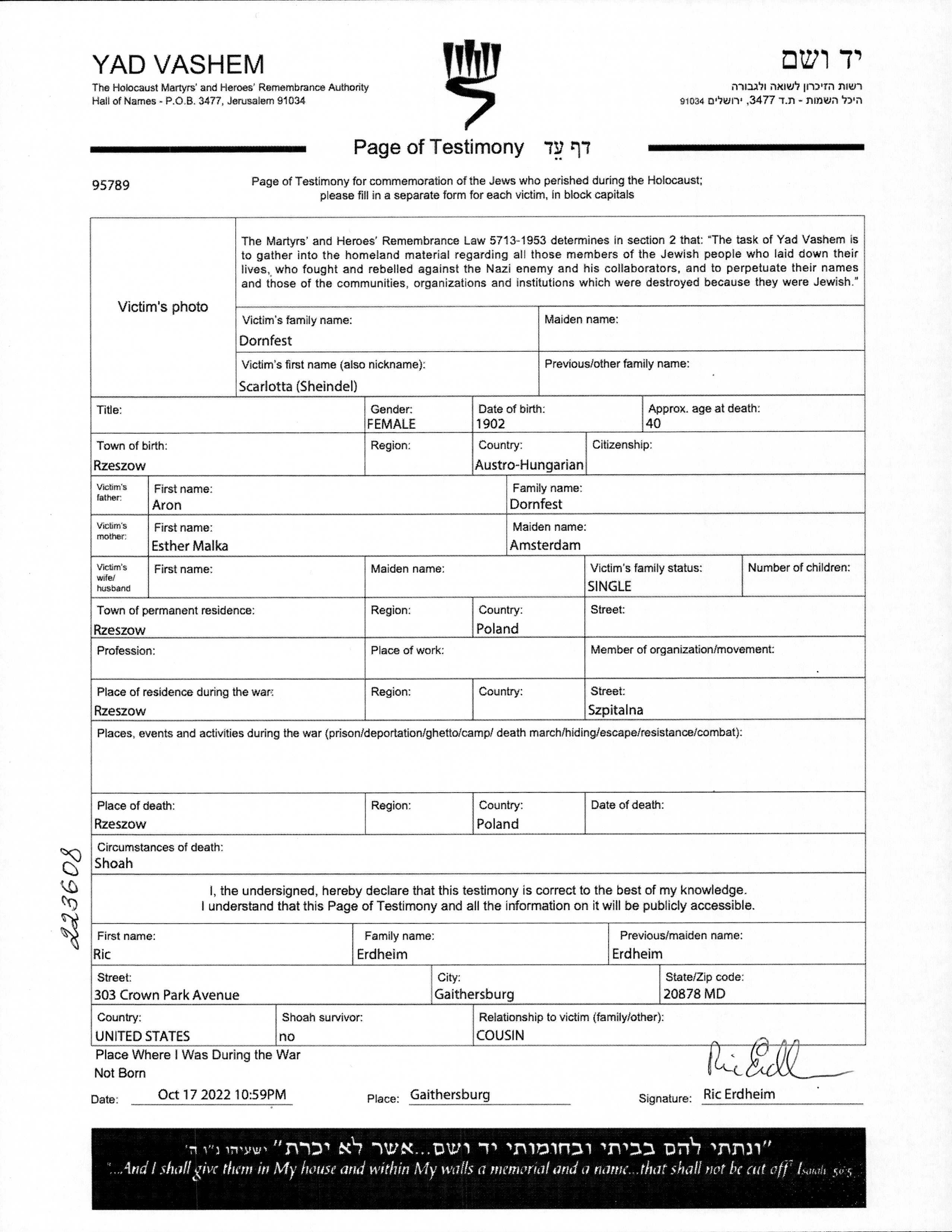 Sharlotta Sheindel Dornfest נולדה בRzeszow שבפולין בשנת 1902 לAron וEsther Malka לבית Amsterdam. היא היתה רווקה. לפני מלחמת העולם השניה התגוררה בRzeszow שבפולין. בזמן המלחמה היא היתה בRzeszow שבפולין. היא נרצחה בשואה. מקום המוות: Rzeszow שבפולין.