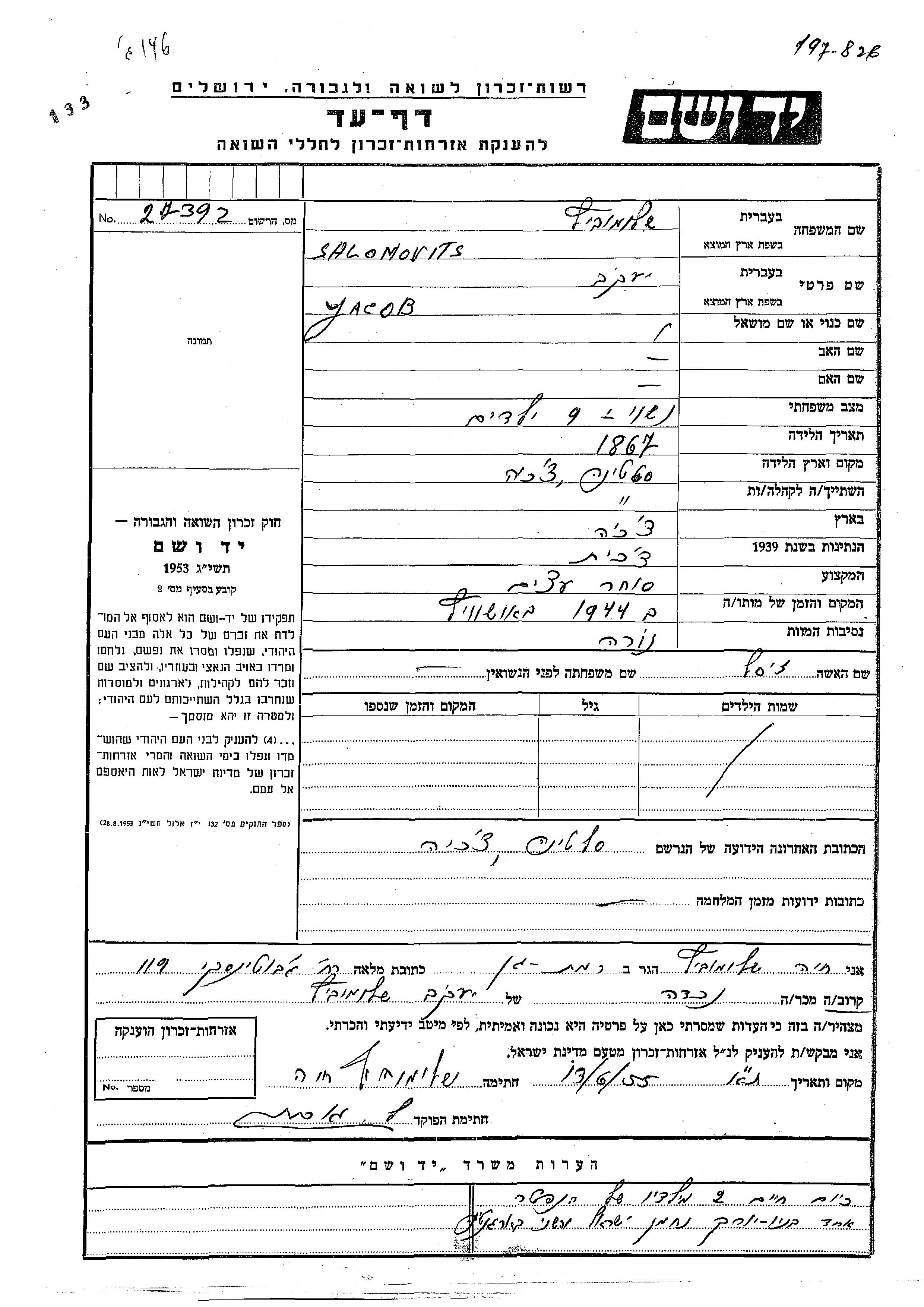 Yacob Salomovits נולד בSlatina שבצ'כוסלובקיה בשנת 1867. הוא היה סוחר עצים ונשוי לזיסל. לפני מלחמת העולם השניה התגורר בSlatina שבצ'כוסלובקיה. בזמן המלחמה הוא היה בSlatina שבצ'כוסלובקיה. הוא נרצח בשואה. מקום המוות: Auschwitz שבפולין בשנת 1944.