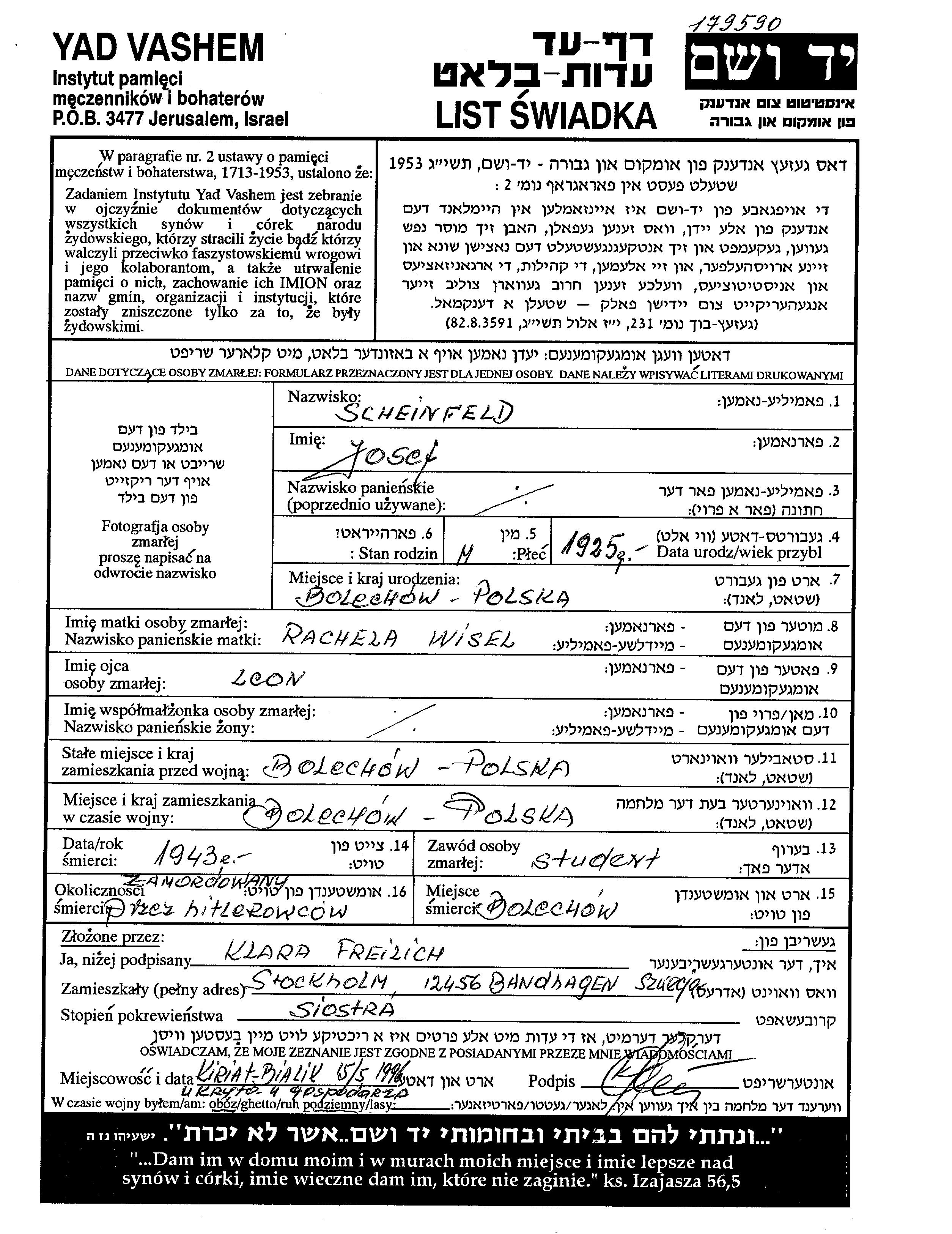 Josef Scheinfeld נולד בBolechow שבפולין בשנת 1925 ללאון וRachela לבית Wisel. הוא היה תלמיד ורווק. לפני מלחמת העולם השניה התגורר בBolechow שבפולין. בזמן המלחמה הוא היה בBolechow שבפולין.