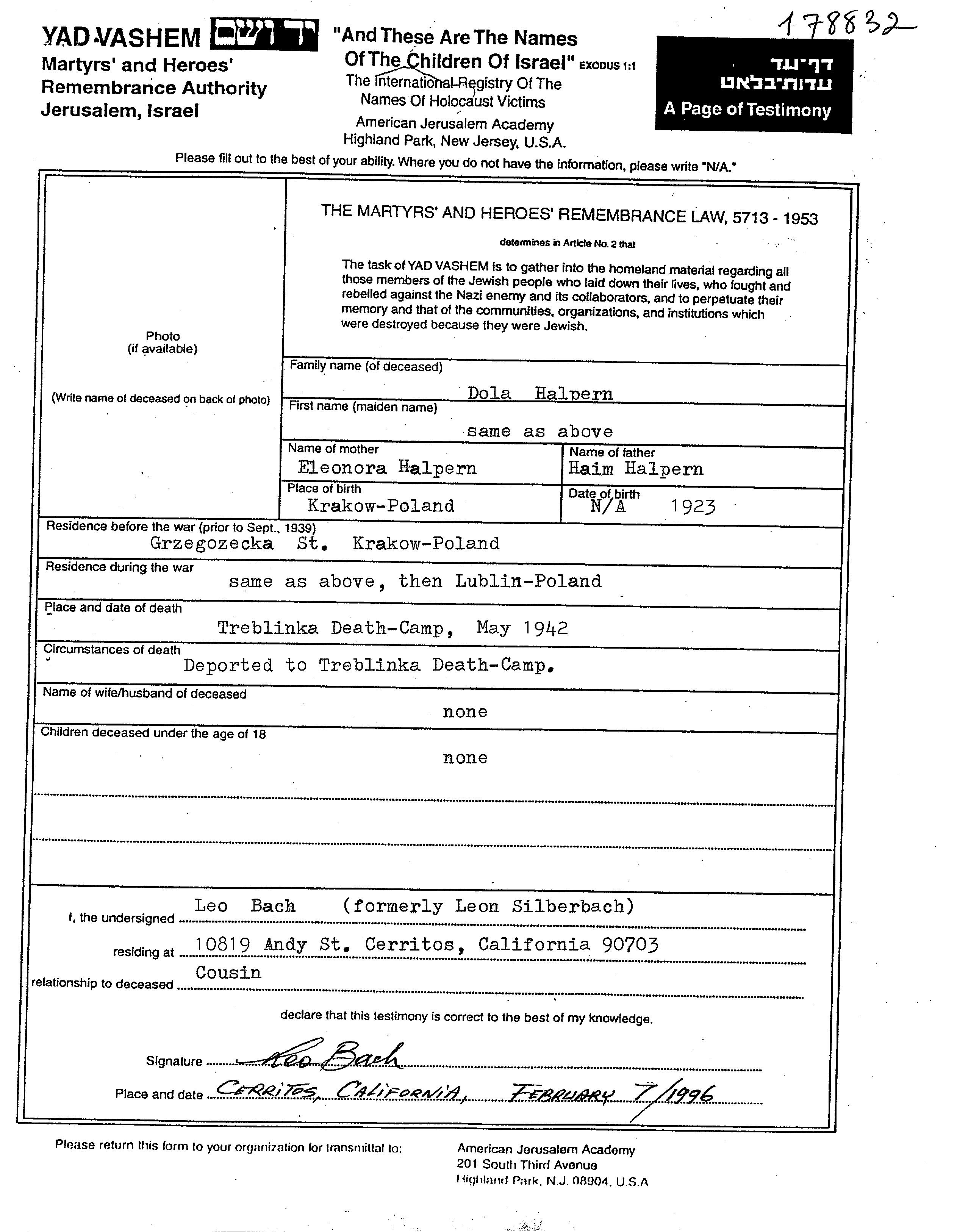דולה הלפרן נולדה בKrakow שבפולין בשנת 1923 לHaim ואלאונורה. היא היתה רווקה. לפני מלחמת העולם השניה התגוררה בKrakow שבפולין. בזמן המלחמה היא היתה בLublin שבפולין. דולה נרצחה בשואה. מקום המוות: Treblinka שבפולין בשנת 1942.