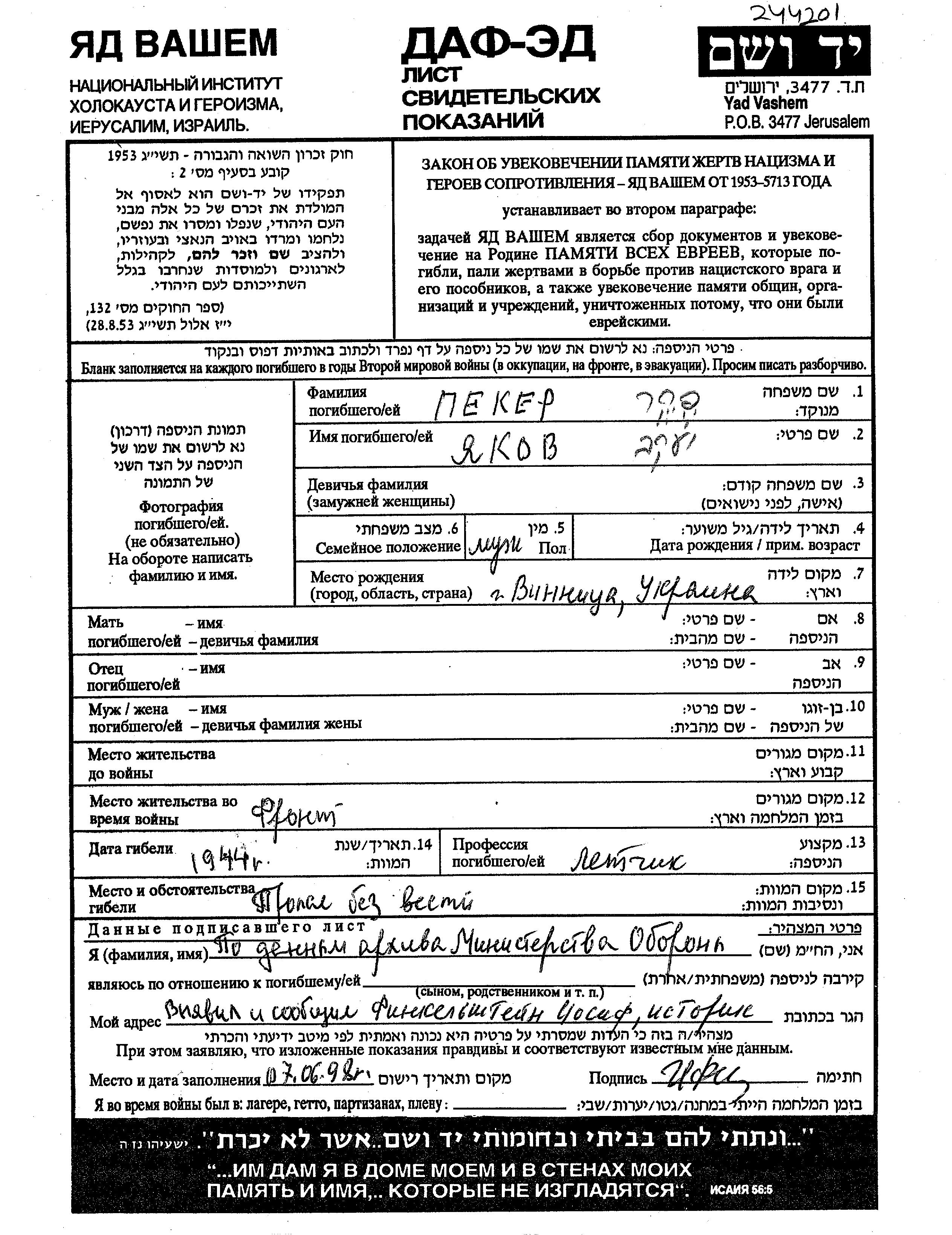 Yakov פקר נולד בVinnitsa שבאוקראינה (ברה"מ) בשנת 1922. הוא היה טייס. לפני מלחמת העולם השניה התגורר בVinnitsa שבאוקראינה (ברה"מ).
