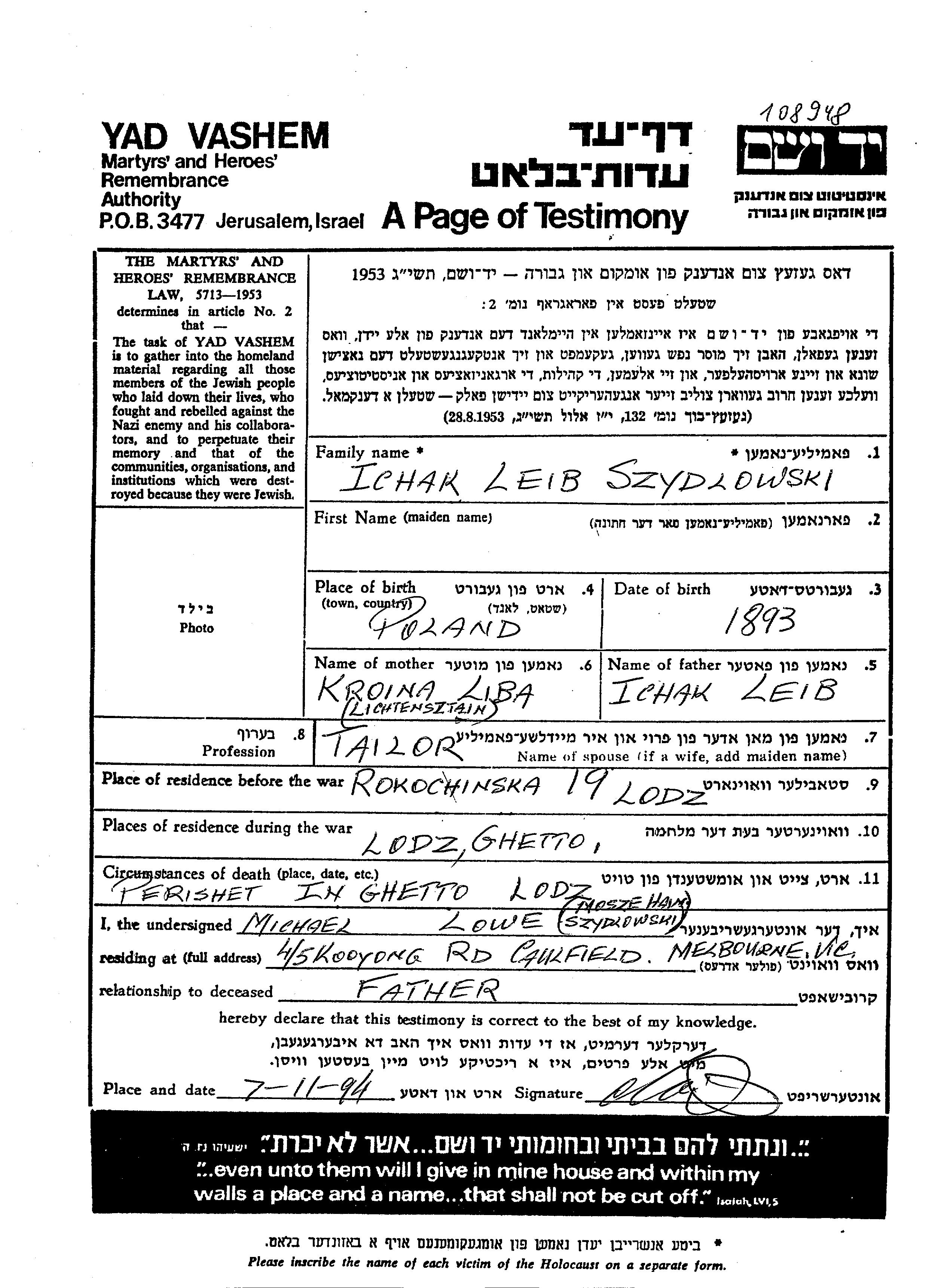 Ichak לייב Szydlowski נולד בפולין בשנת 1893. הוא היה חייט. לפני מלחמת העולם השניה התגורר בLodz שבפולין.