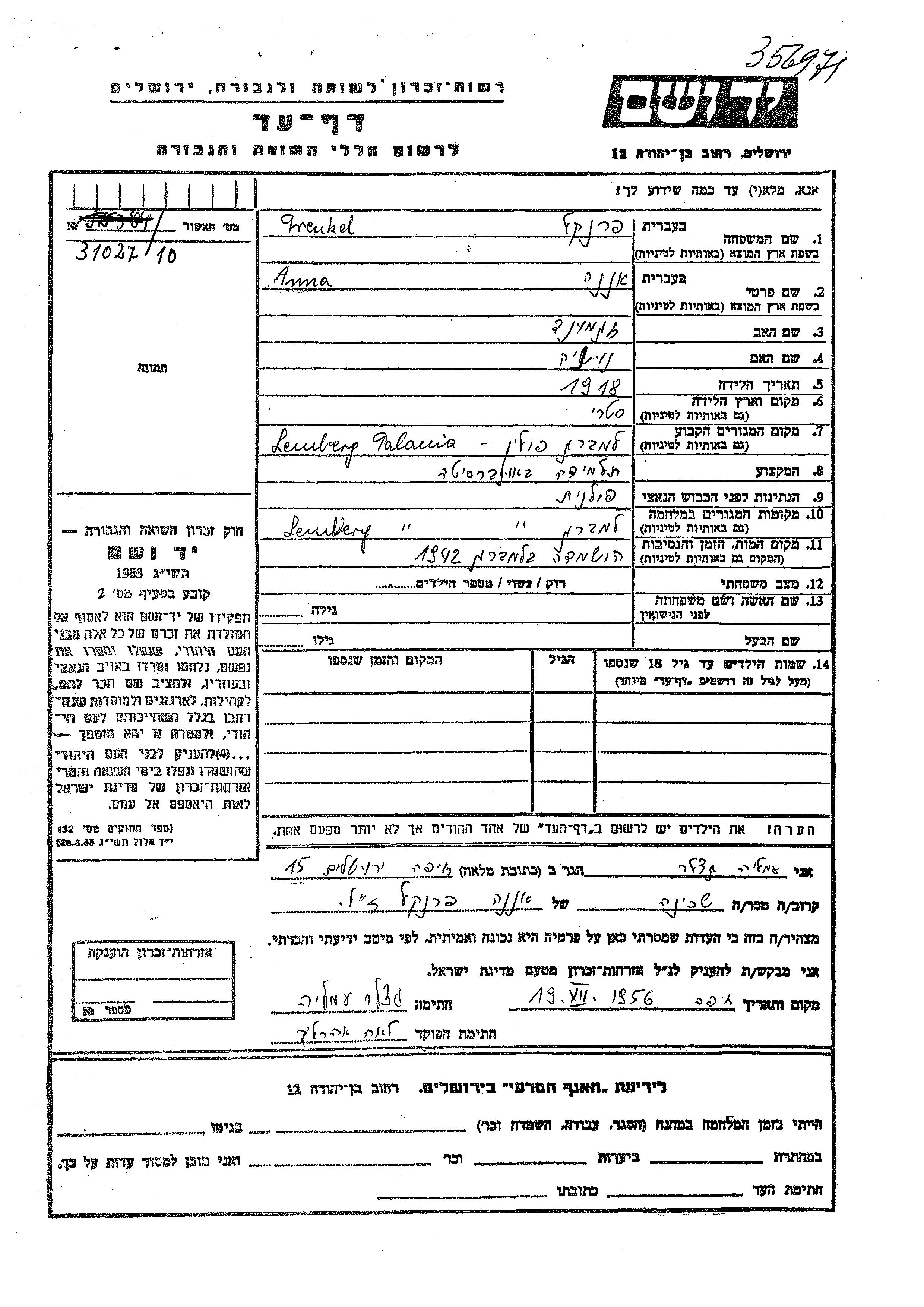 אנה פרנקל נולדה בStryj שבפולין בשנת 1918 לזגמונד ונוניה. היא היתה סטודנטית באוניברסיטה ורווקה. לפני מלחמת העולם השניה התגוררה בLemberg שבפולין. בזמן המלחמה היא היתה בLemberg שבפולין. אנה נרצחה בשואה. מקום המוות: Lemberg שבפולין בשנת 1942.