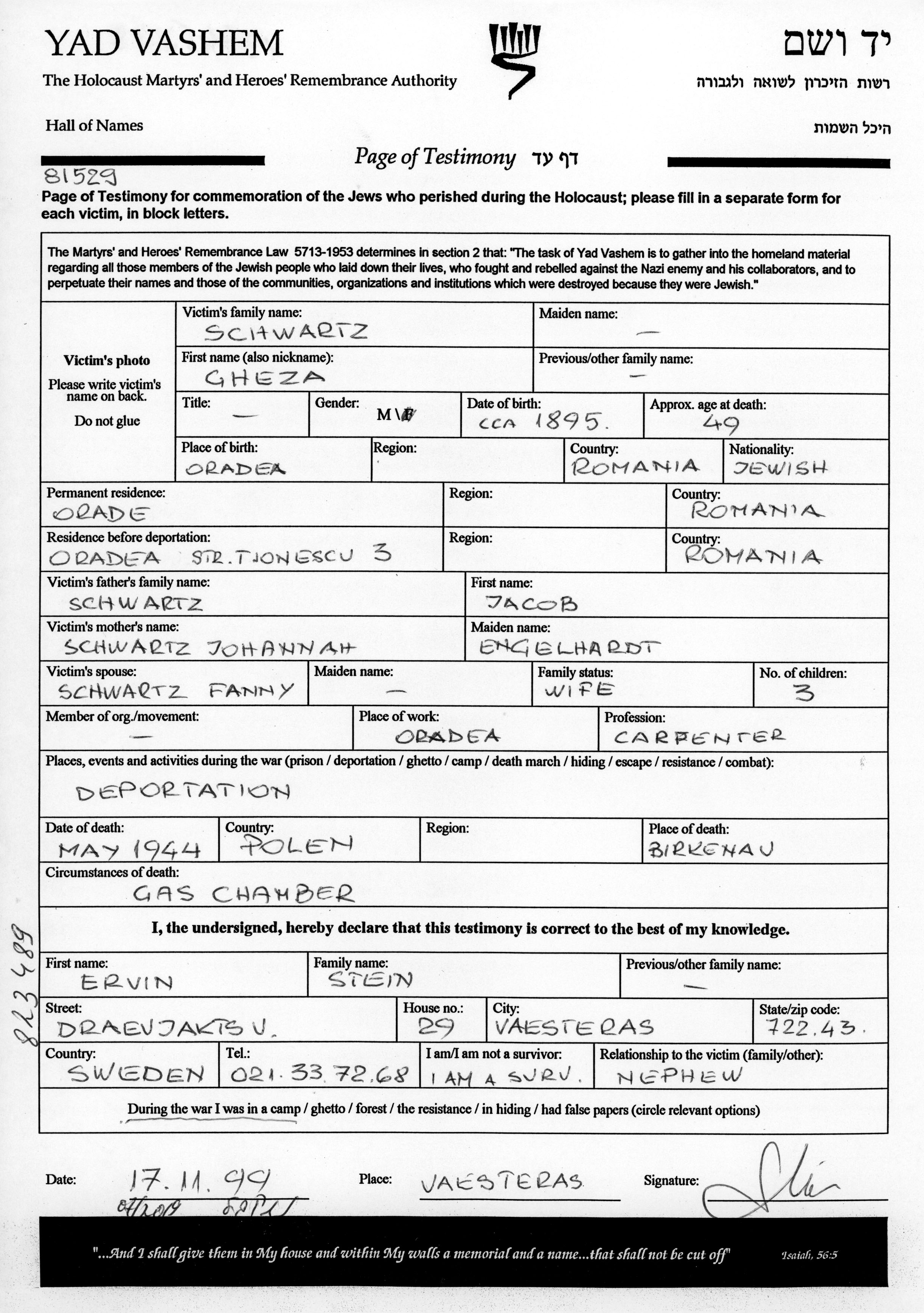 Geza Schwartz נולד בOradea שברומניה בשנת 1891. הוא היה נגר. לפני מלחמת העולם השניה התגורר בOradea שברומניה.