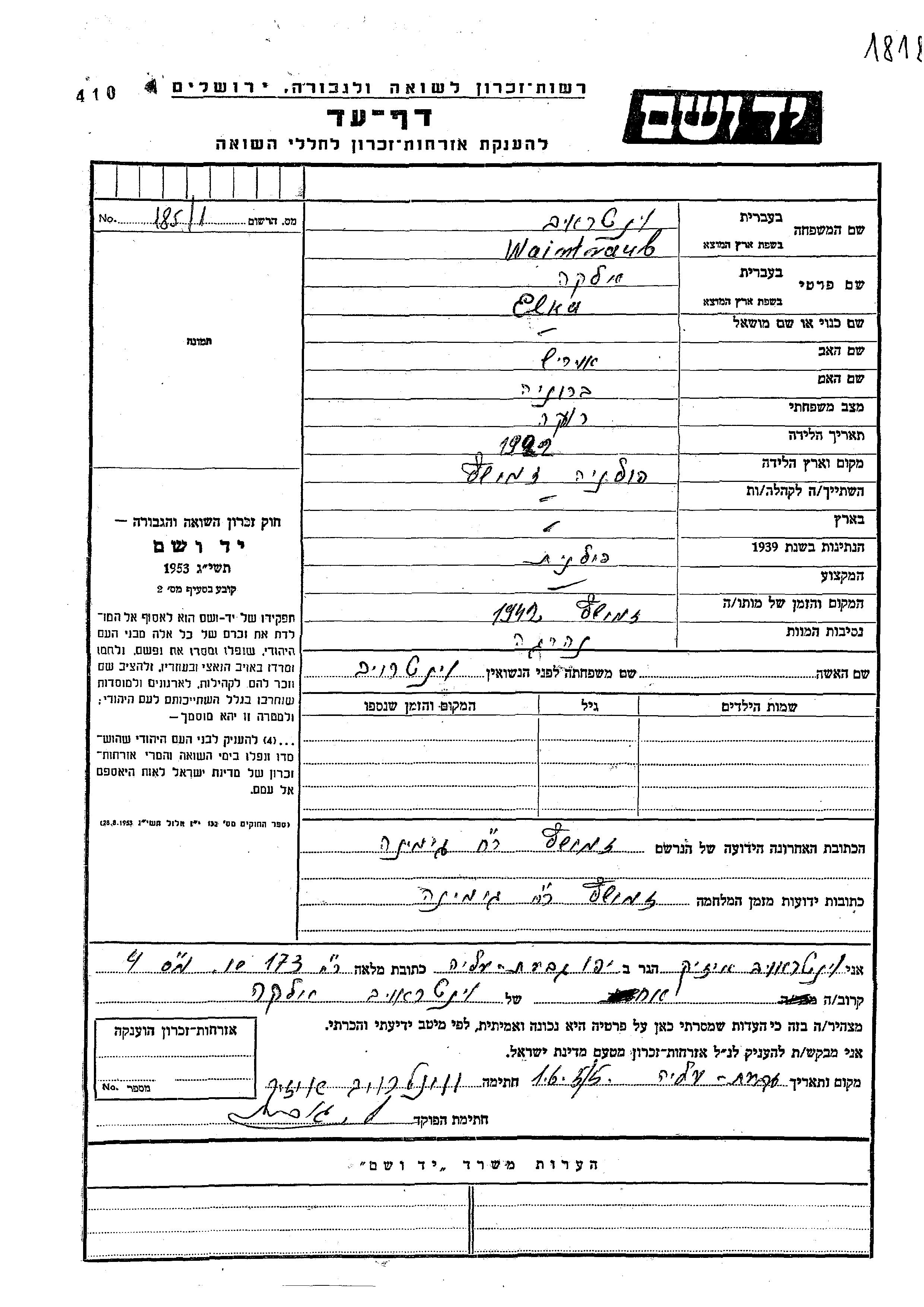 אלקה Waintraub נולדה בZamosc שבפולין בשנת 1892 לאוריש וברוניה. היא היתה רווקה. לפני מלחמת העולם השניה התגוררה בZamosc שבפולין. בזמן המלחמה היא היתה בZamosc שבפולין. אלקה נרצחה בשואה. מקום המוות: Zamosc שבפולין בשנת 1942.