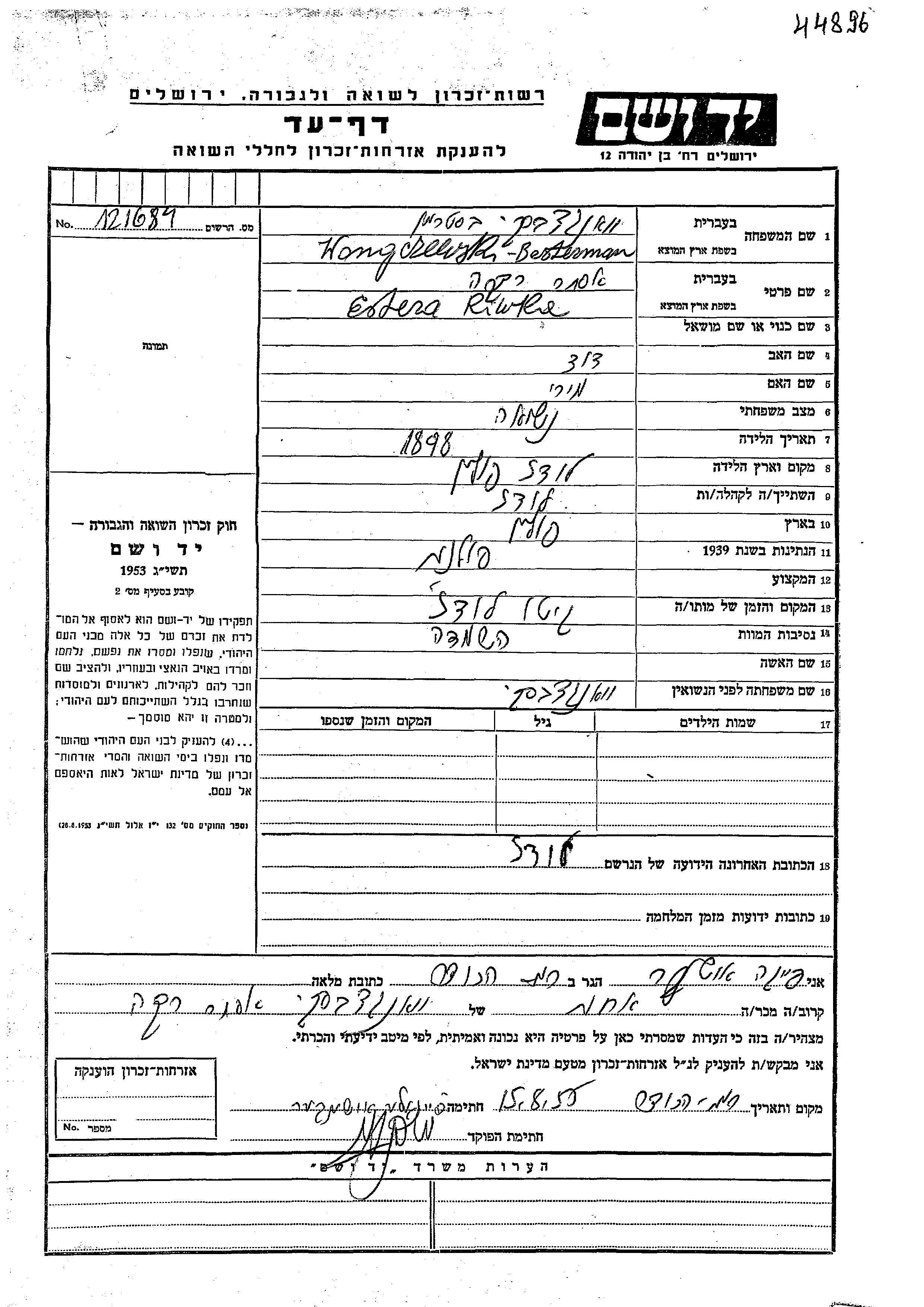 Estera Riwke בסטרמן לבית Wangczewski נולדה בLodz שבפולין בשנת 1898 לדוד ומירי. היא היתה נשואה. לפני מלחמת העולם השניה התגוררה במקום לא רשום. בזמן המלחמה היא היתה בLodz שבפולין. היא נרצחה בשואה. מקום המוות: Lodz שבפולין.