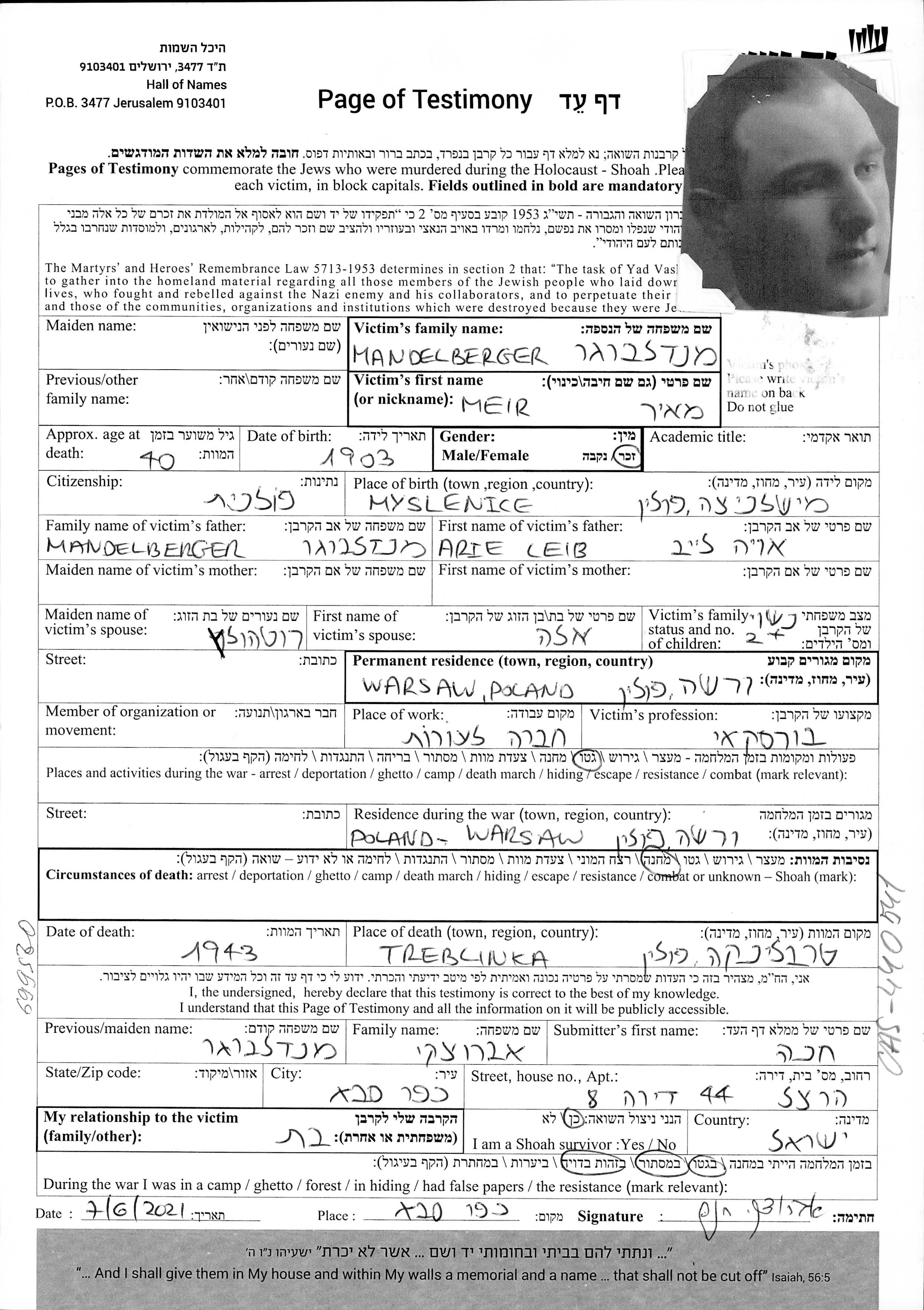 מאיר מנדלברגר נולד בMyslenice שבפולין בשנת 1903 לאריה לייב. הוא היה בורסקי ונשוי לאלה לבית רוטהולץ. לפני מלחמת העולם השניה התגורר בWarszawa שבפולין. בזמן המלחמה הוא היה בWarszawa שבפולין. מאיר נרצח בשואה. מקום המוות: Treblinka שבפולין בשנת 1943.